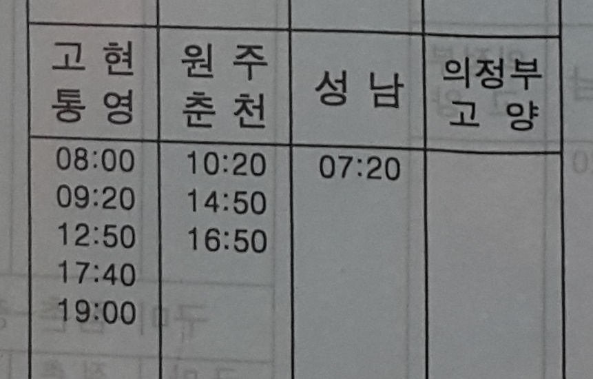 울산 출발 고현, 통영, 원주, 춘천, 성남 방면.