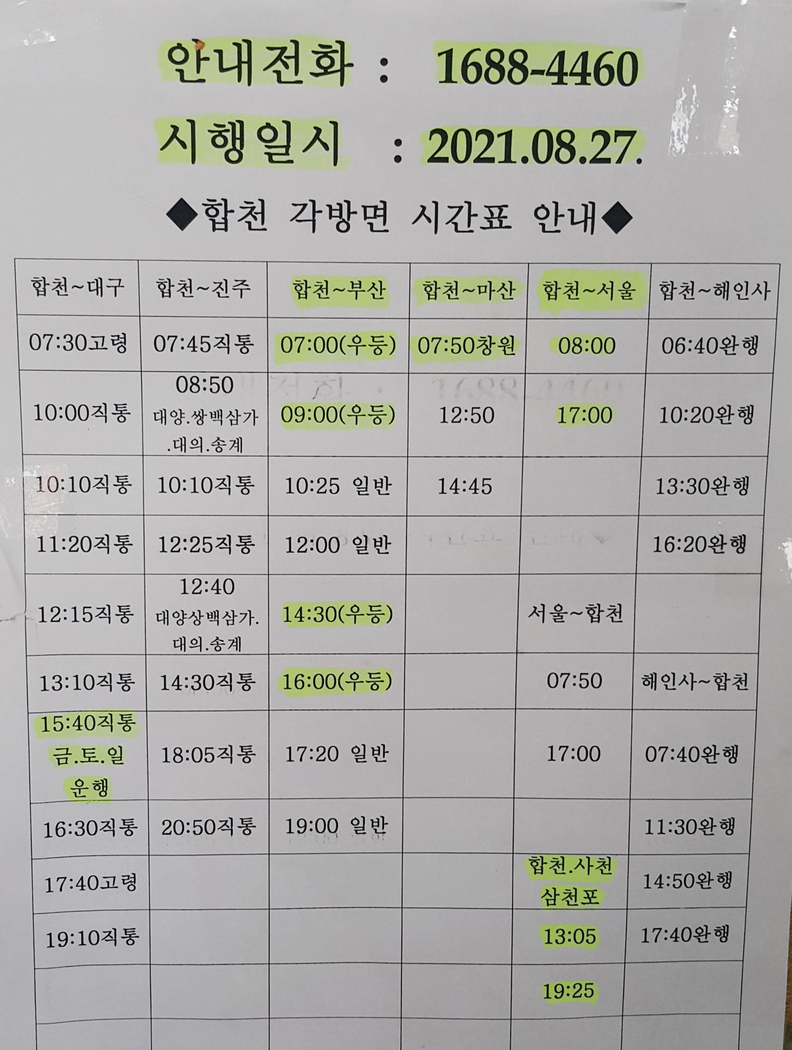 합천 출발 각 방면 시간표