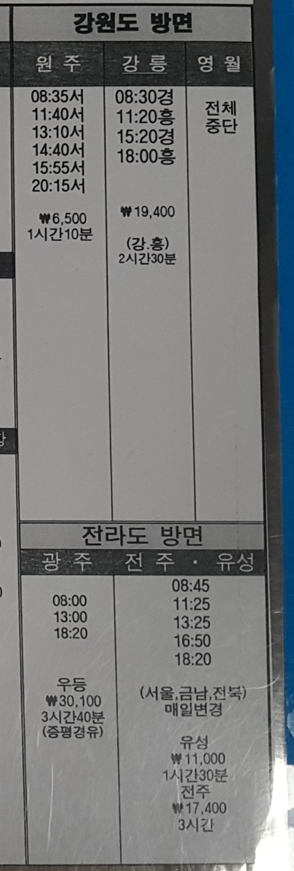 충주 출발 강원도, 전라도 방면.
