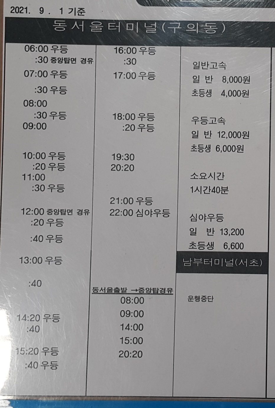 충주 출발 동서울터미널, 구의동 남부터미널, 서초 방면.
