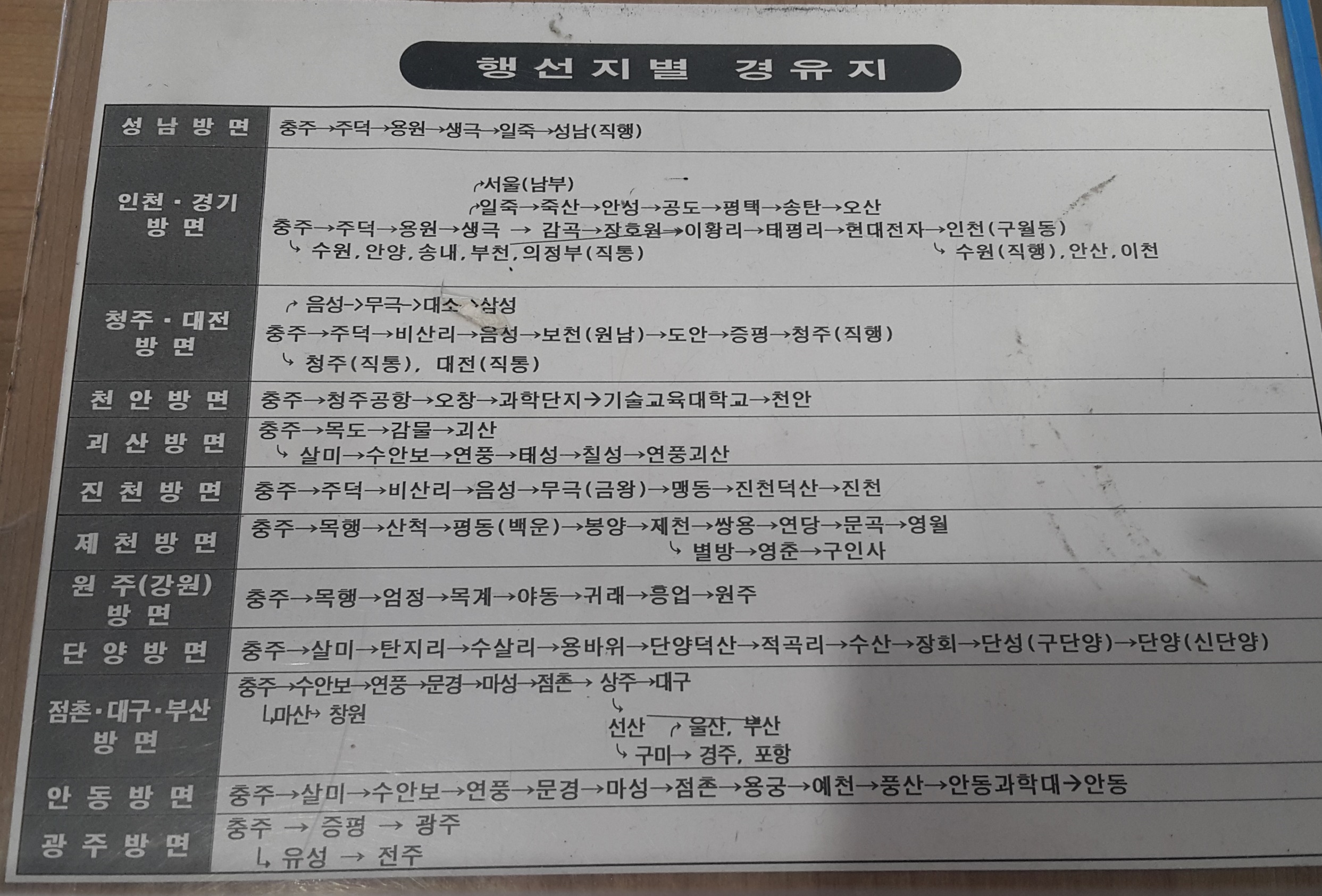 충주시외버스터미널 행선지별 경우지 안내