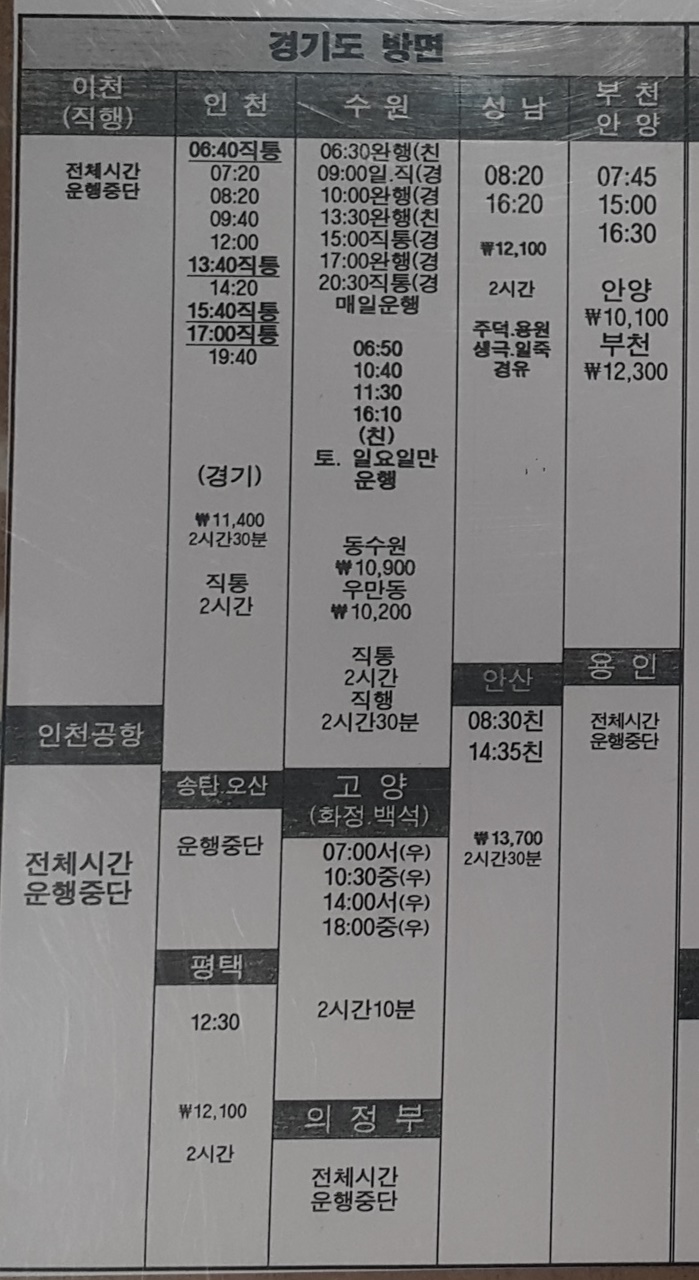 이천, 인천, 수원, 성남, 부천, 안양, 인천공항, 송탄, 오산, 평택, 고양, 화정, 백석, 의정부, 안산, 용인 방면.