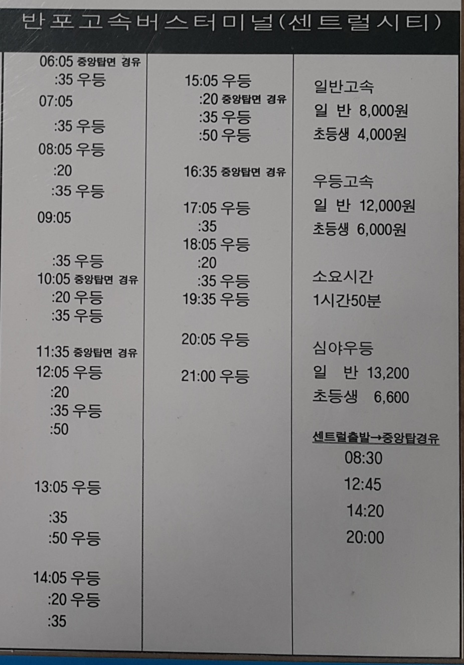 충주 출발 반포고속버스터미널, 센트럴시티 방면.
