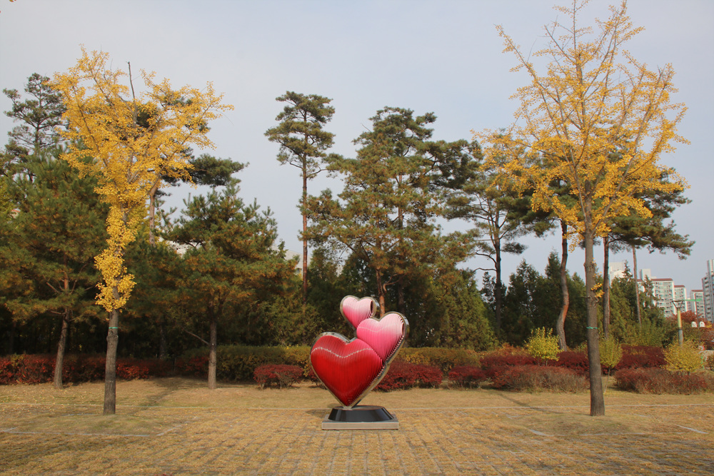 빨간색에서 핑크로 다시 하얀색으로 변하는 하트 조형물이 재미있게 보입니다.