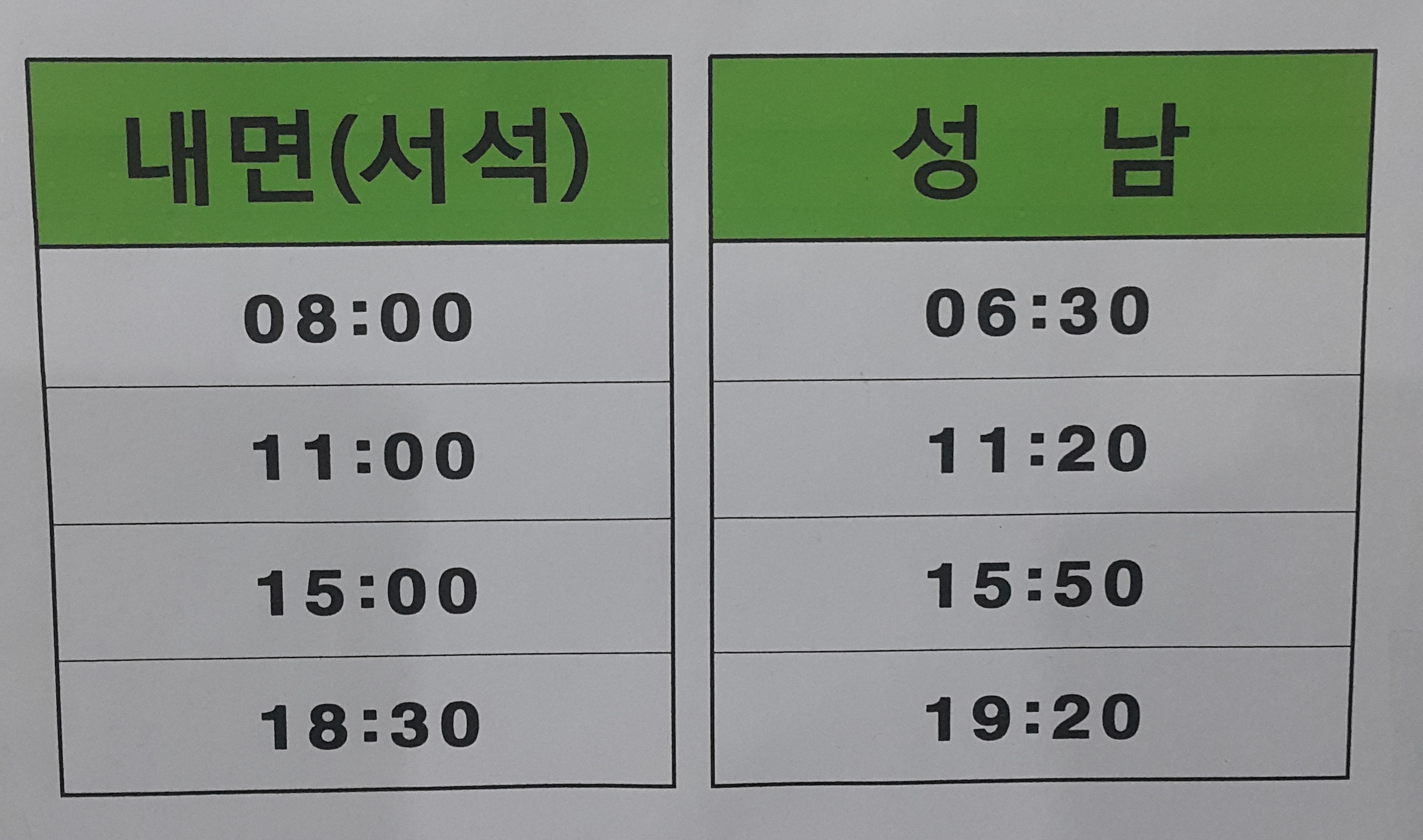 홍천 출발 내면(서석), 성남, 의정부, 고양, 안산, 전주(유성), 경주, 포항, 울산 방면.