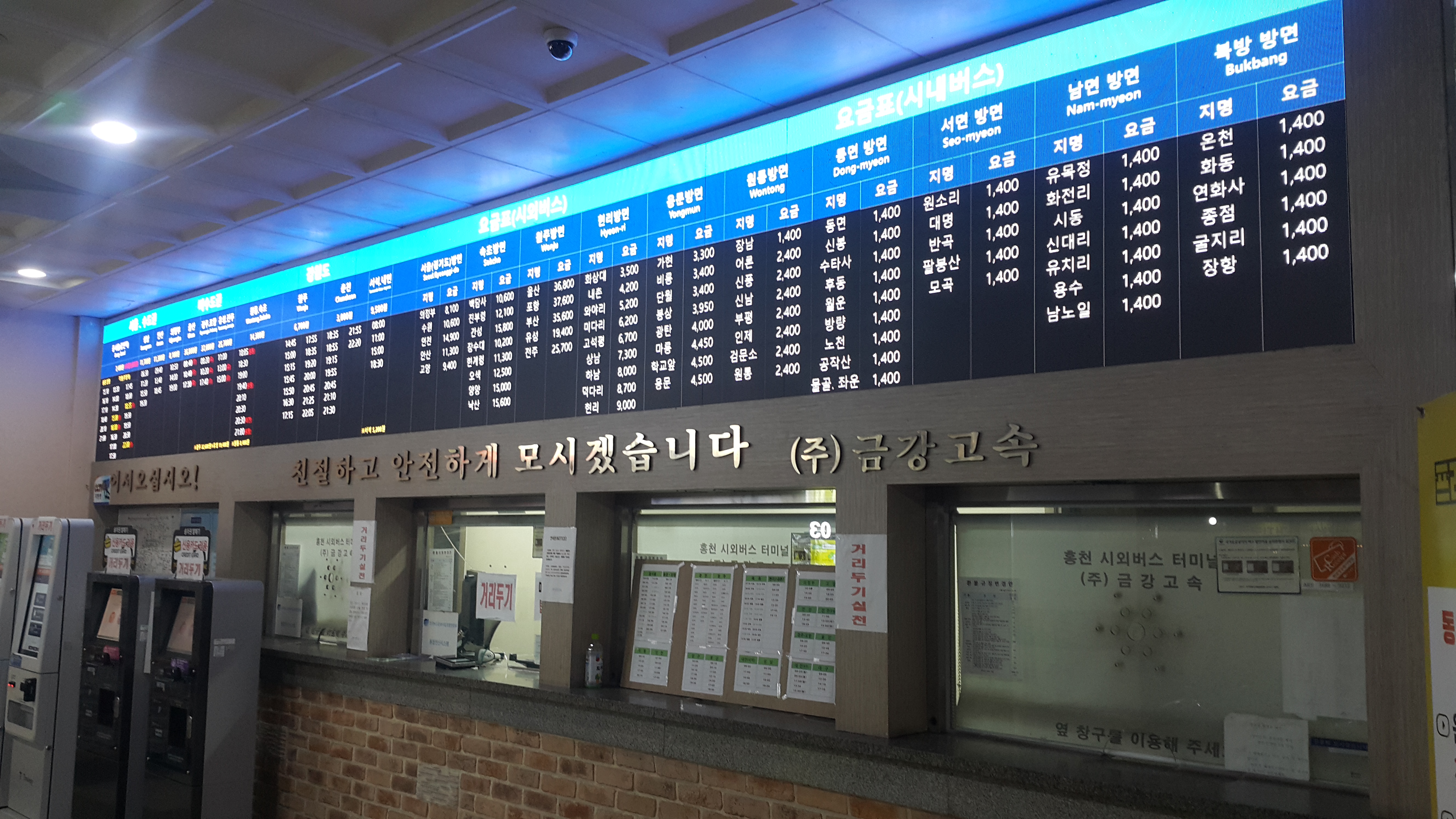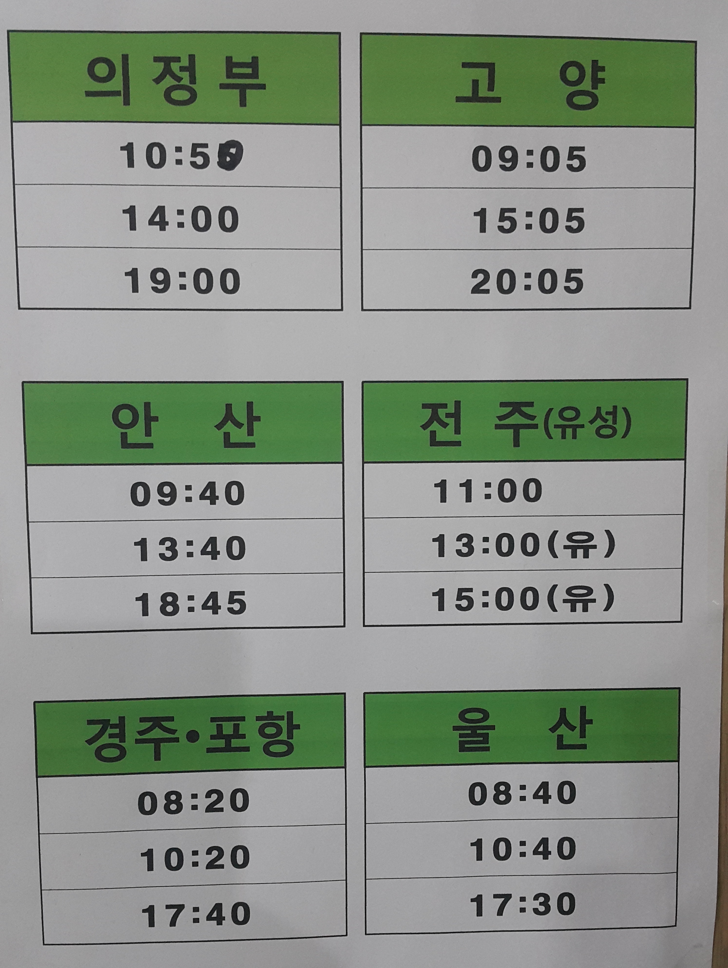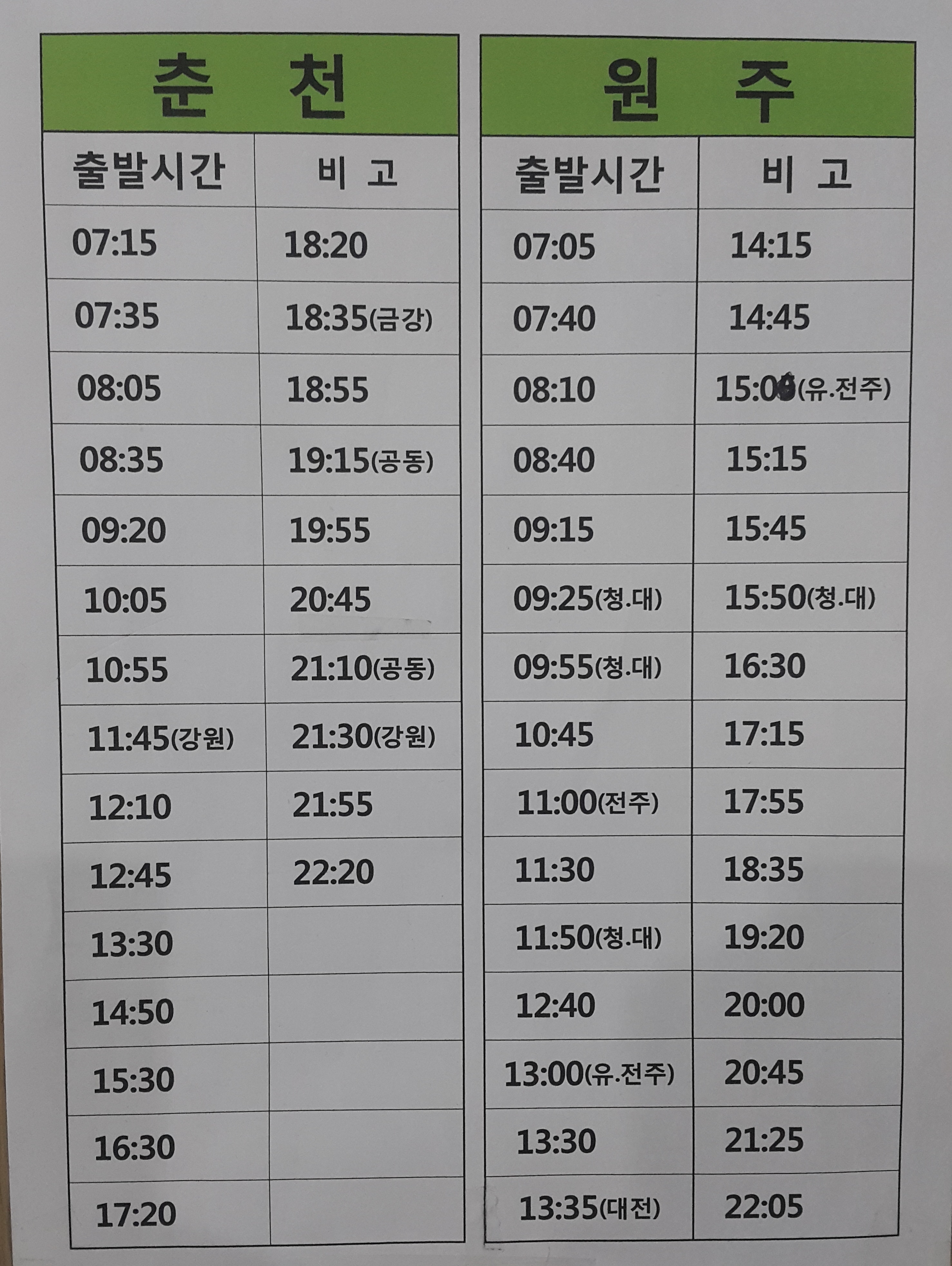 홍천 출발 내면(서석), 성남, 의정부, 고양, 안산, 전주(유성), 경주, 포항, 울산 방면.