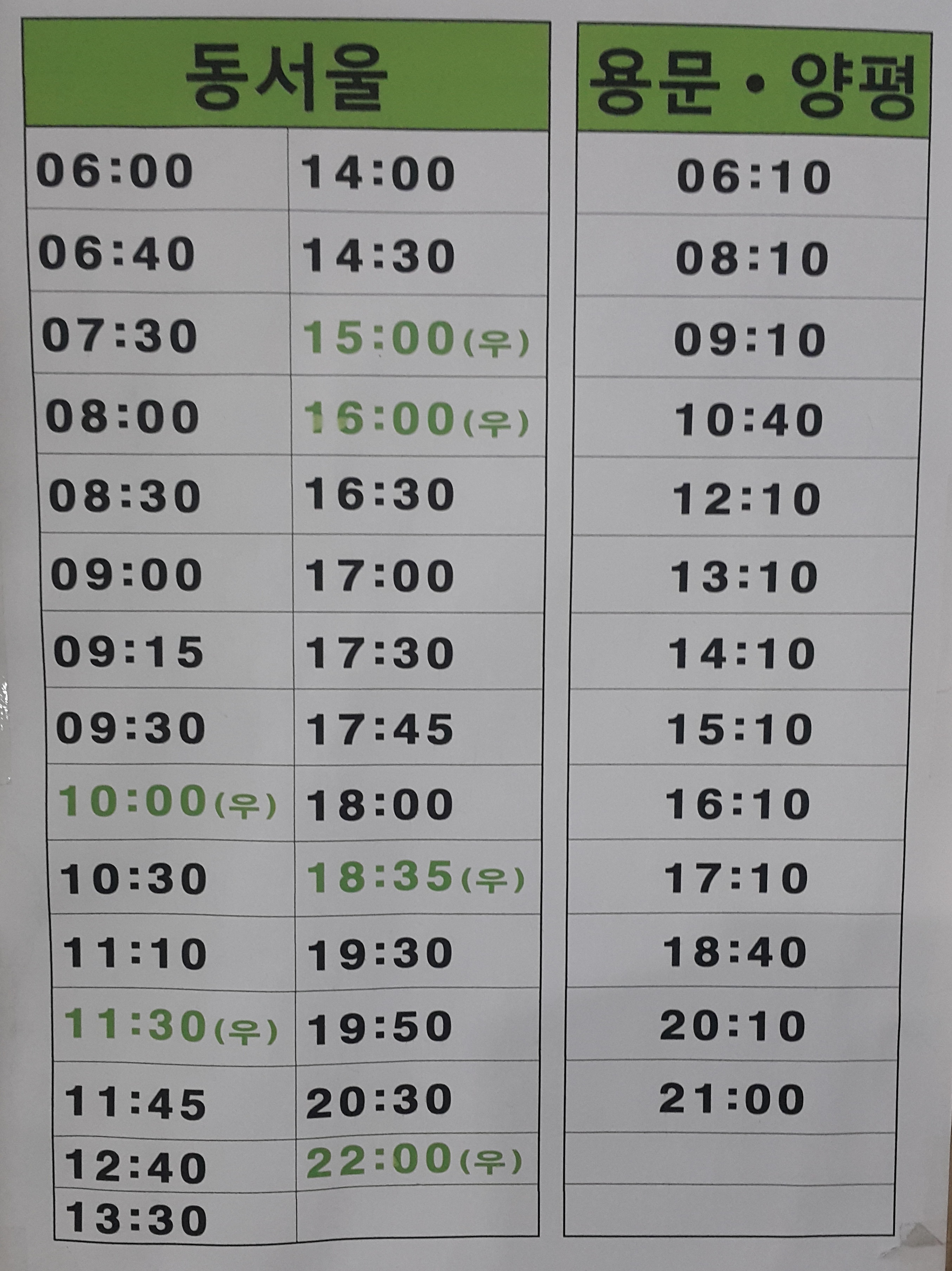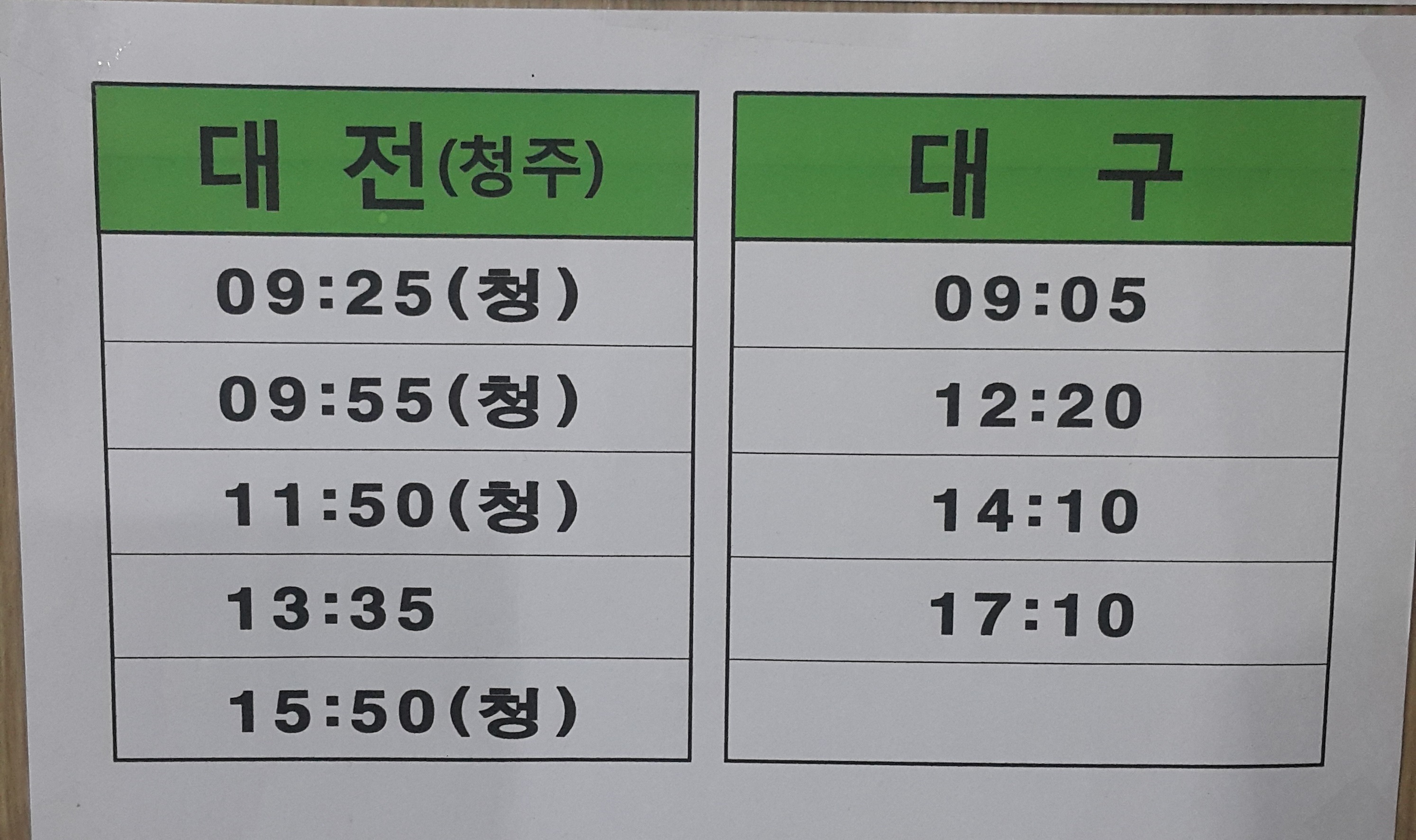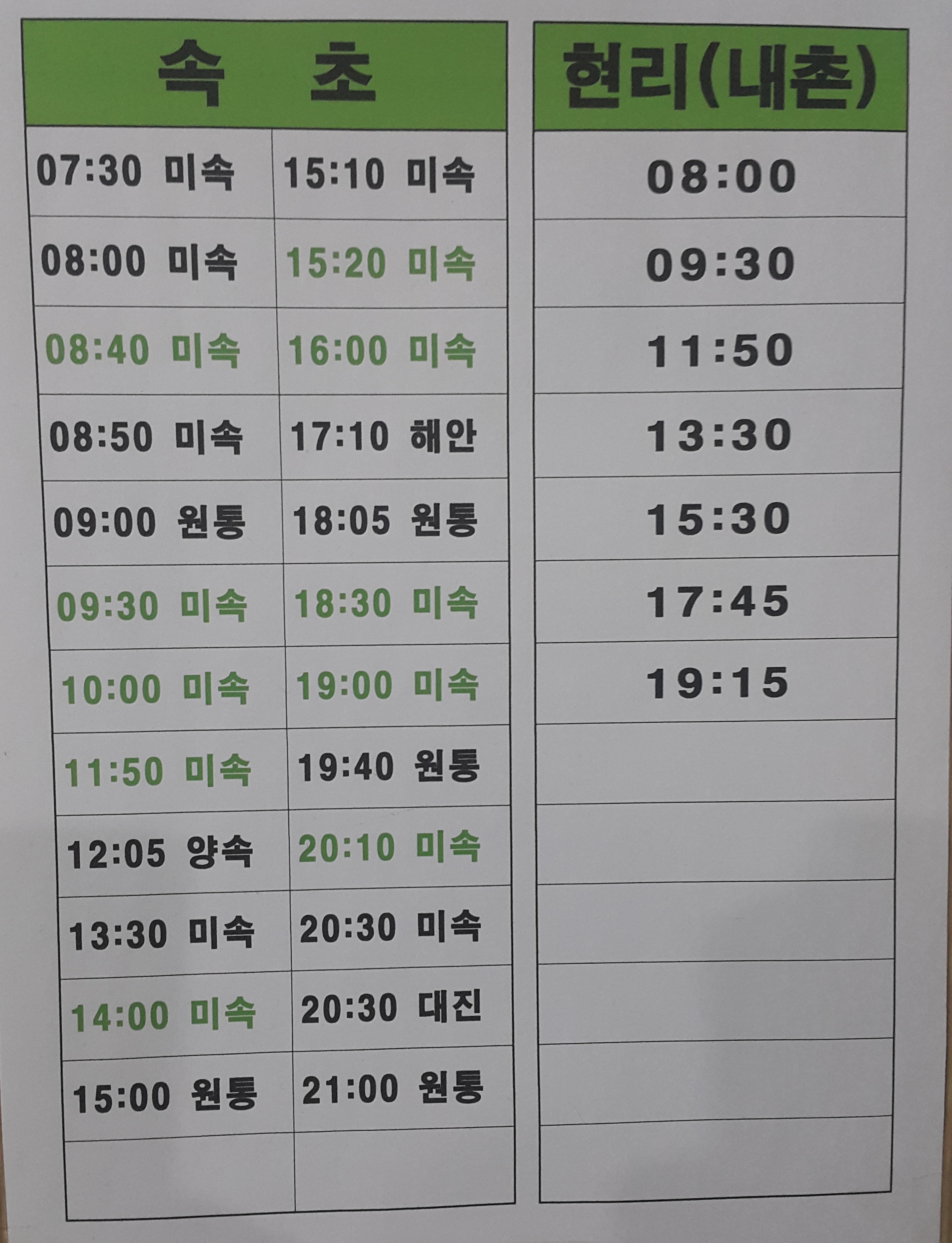 홍천 출발 내면(서석), 성남, 의정부, 고양, 안산, 전주(유성), 경주, 포항, 울산 방면.