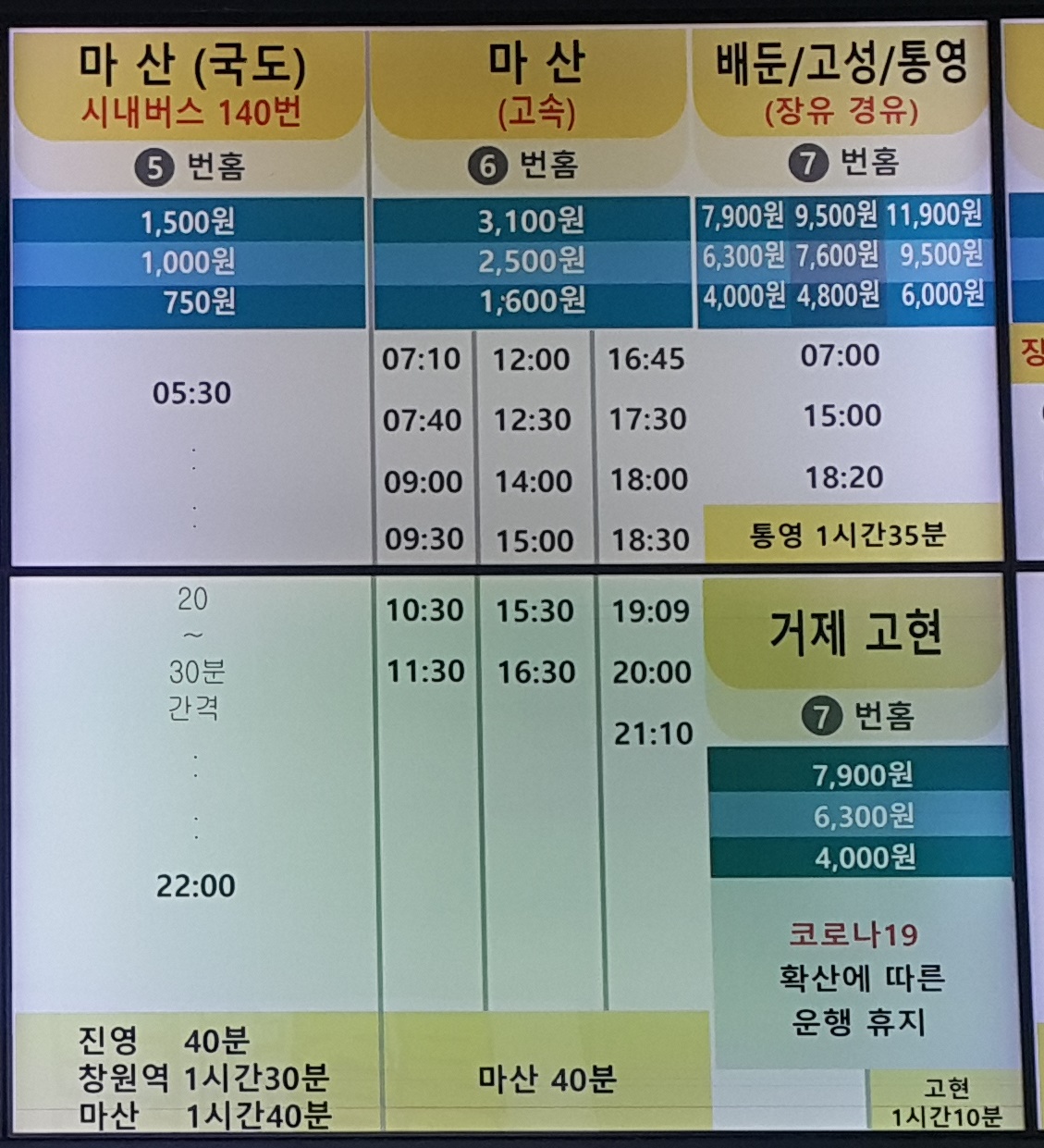 김해 출발 마산, 배둔, 고성, 통영, 거제, 고현 방면.