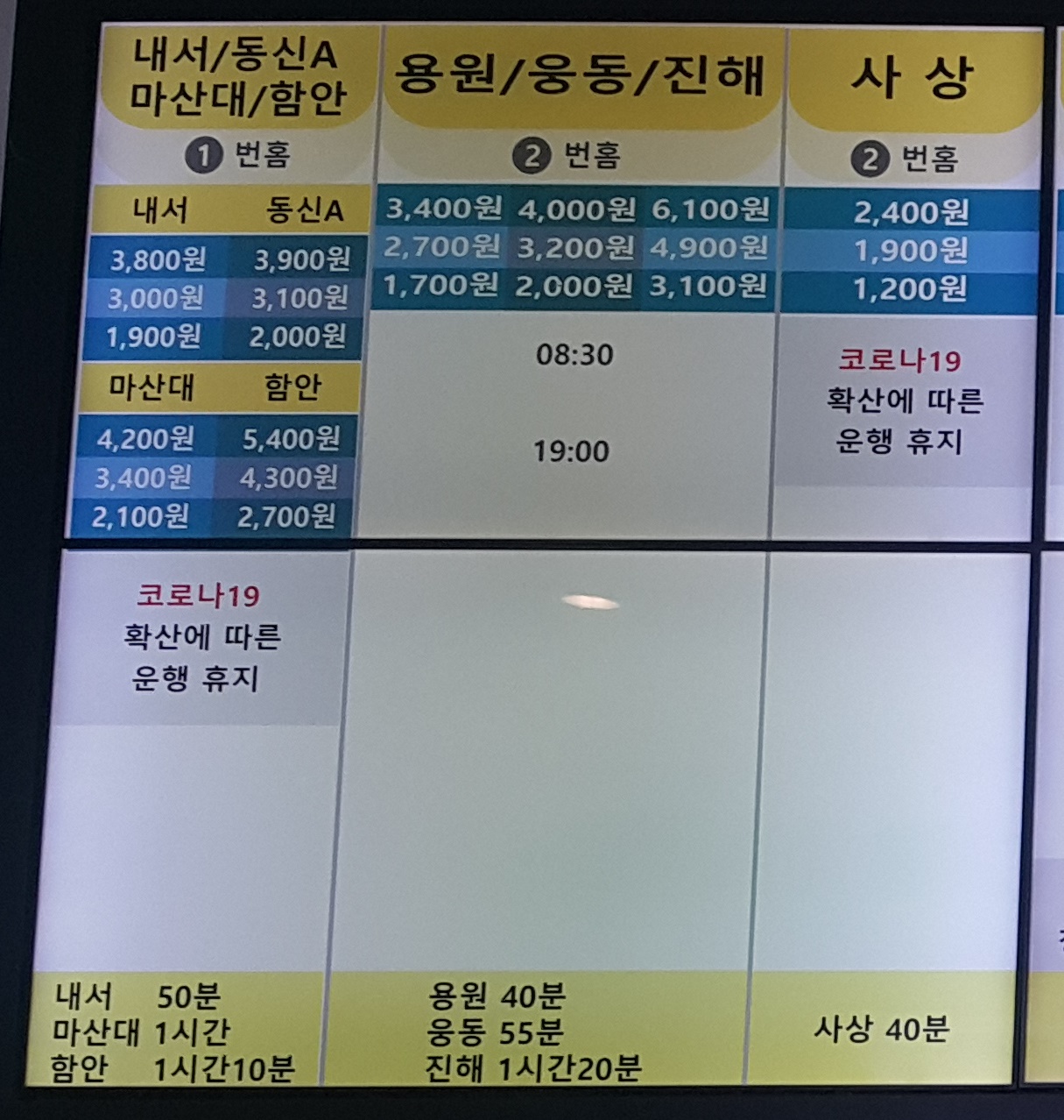 김해 출발 진주, 사천, 용현, 삼천포, 진교, 남해, 밀양 방면.
