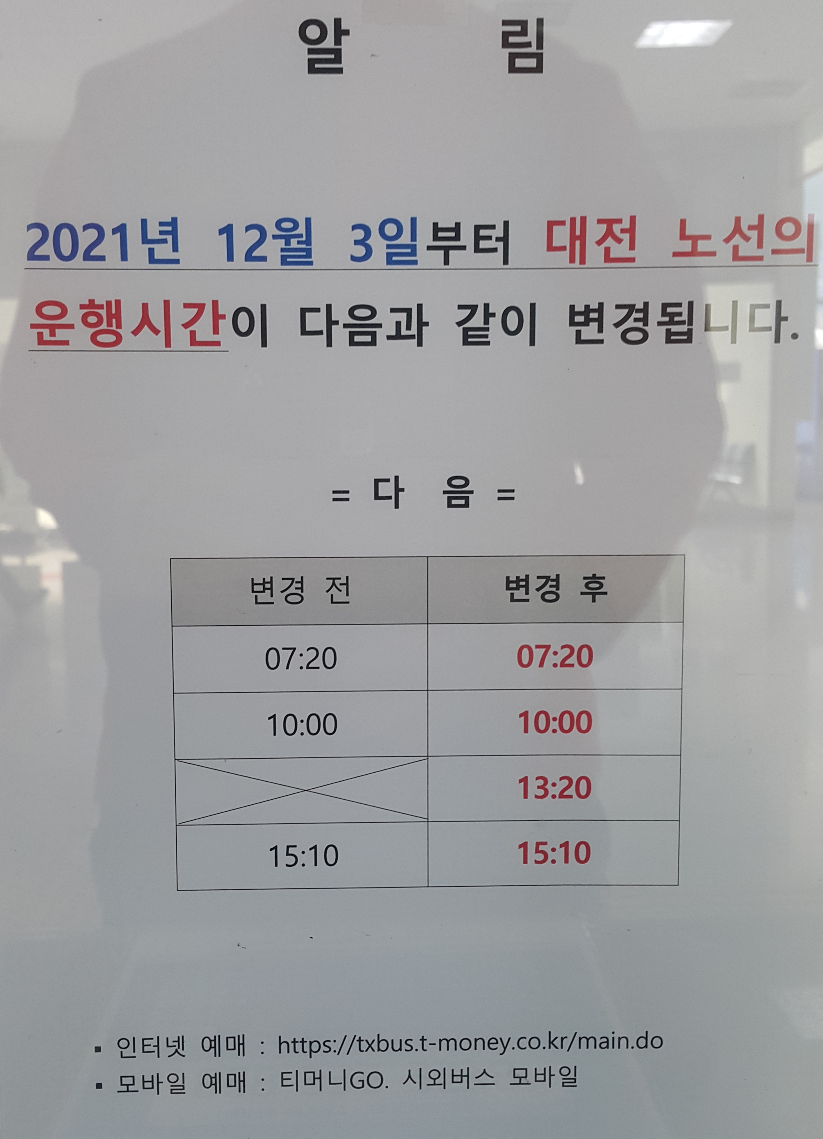 2021년 12월 3일부터 대전 노선의 운행시간이 변경됩니다.