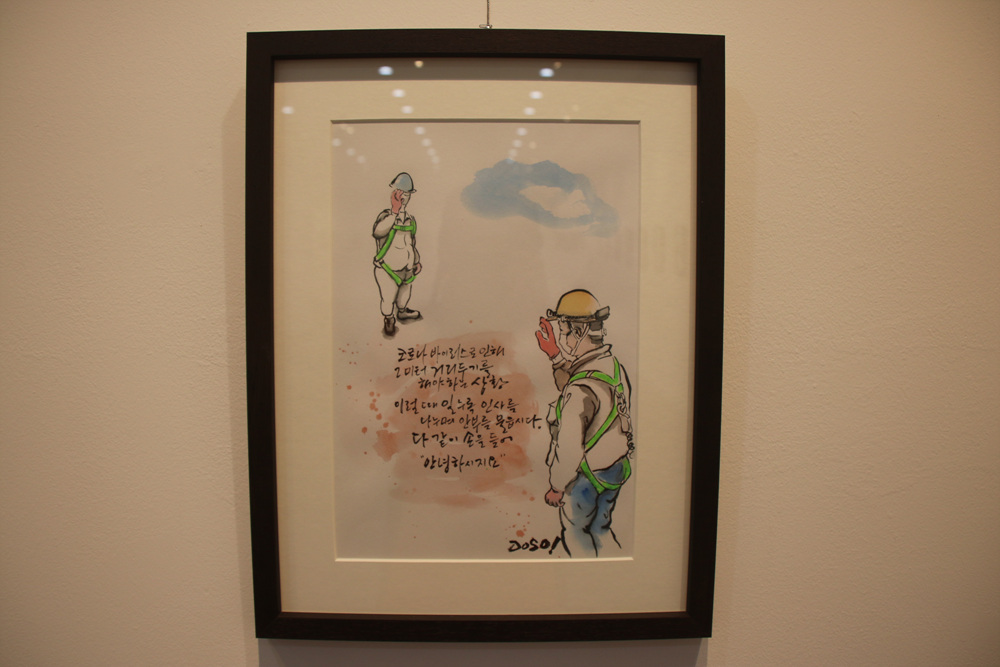 코로나19로 인하여 작업현장에서도 사회적 거리두기가 실천되고 있는 모습이 그려져 있다.