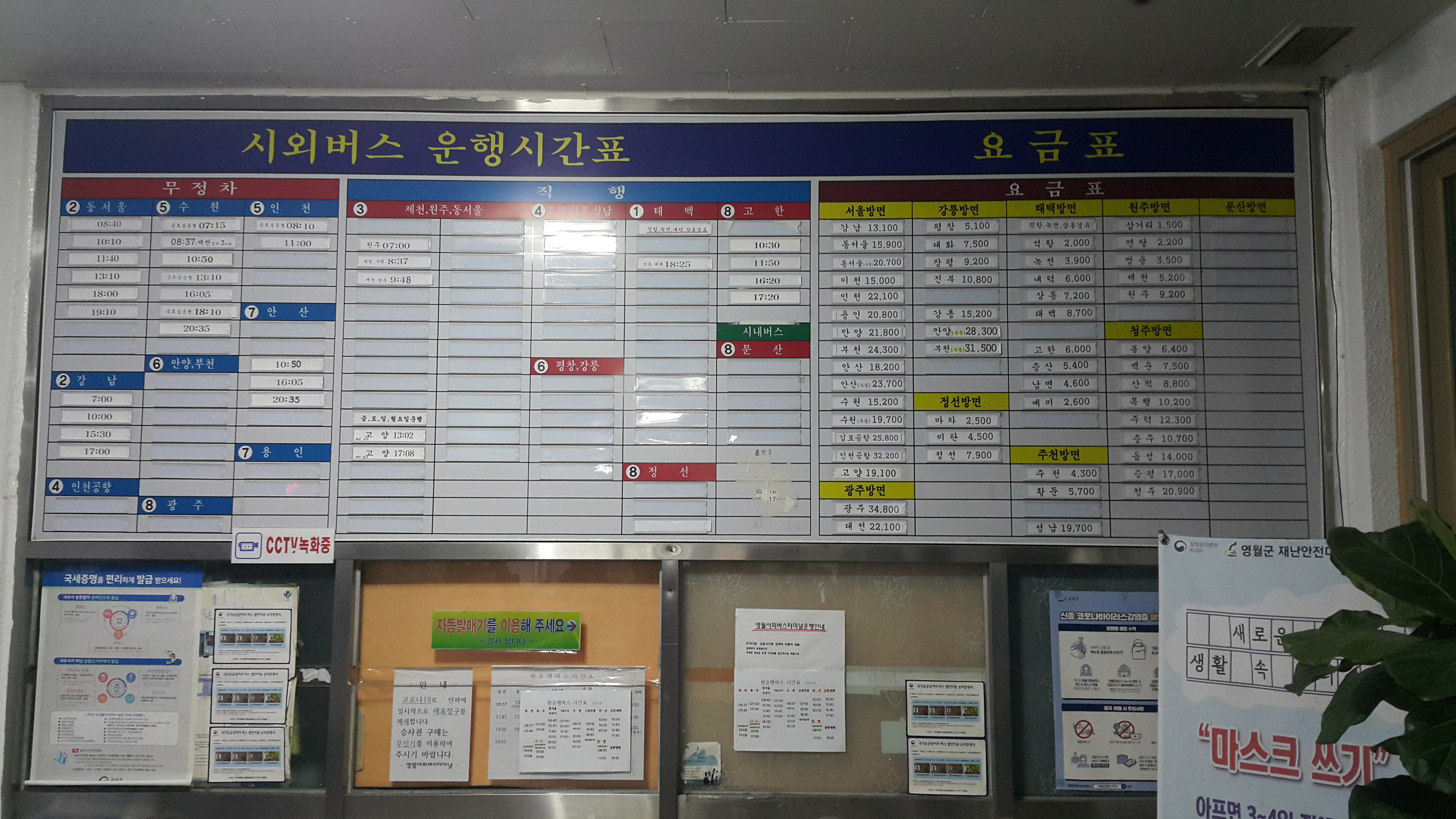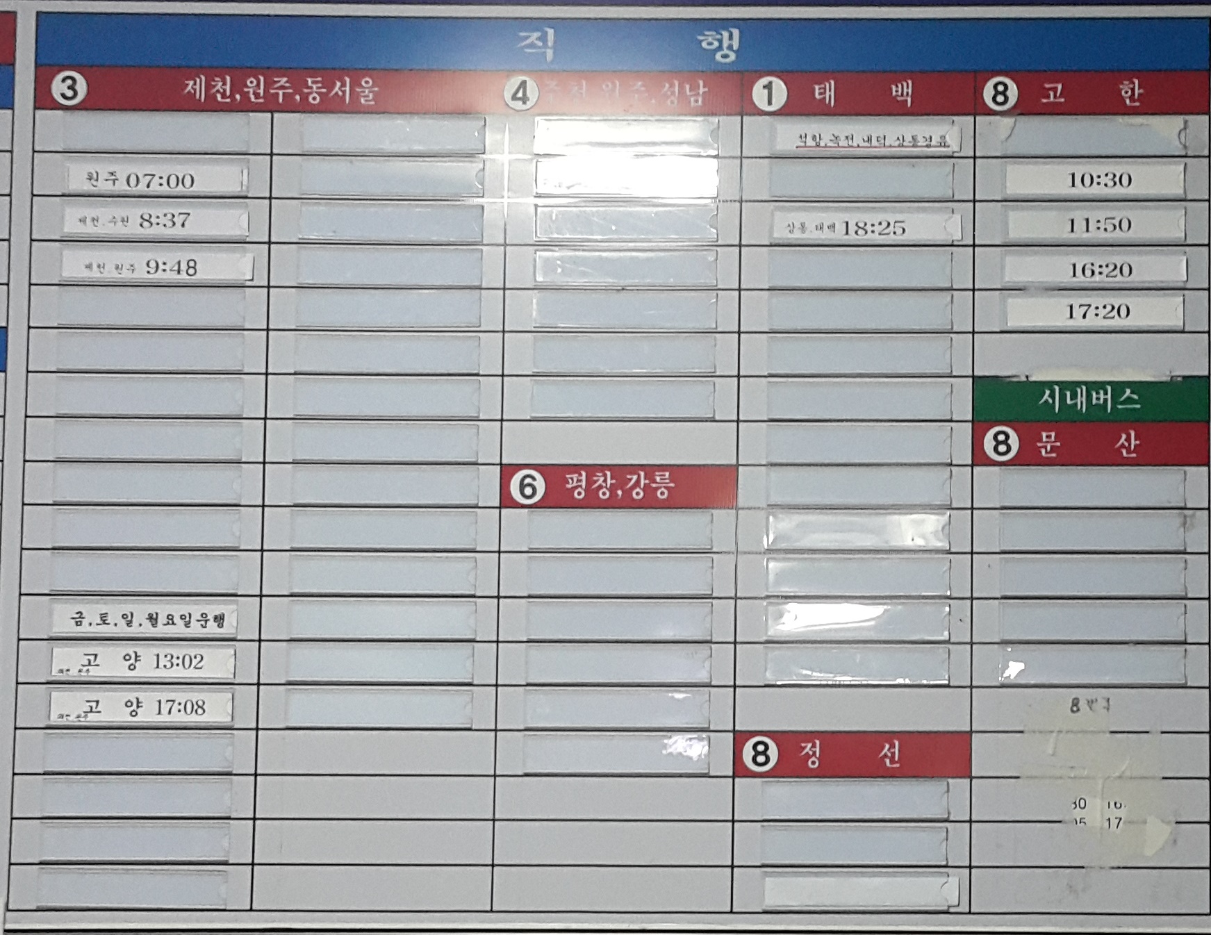 영월 출발 제천, 원주, 동서울, 고양, 태배그 고한 방면.
