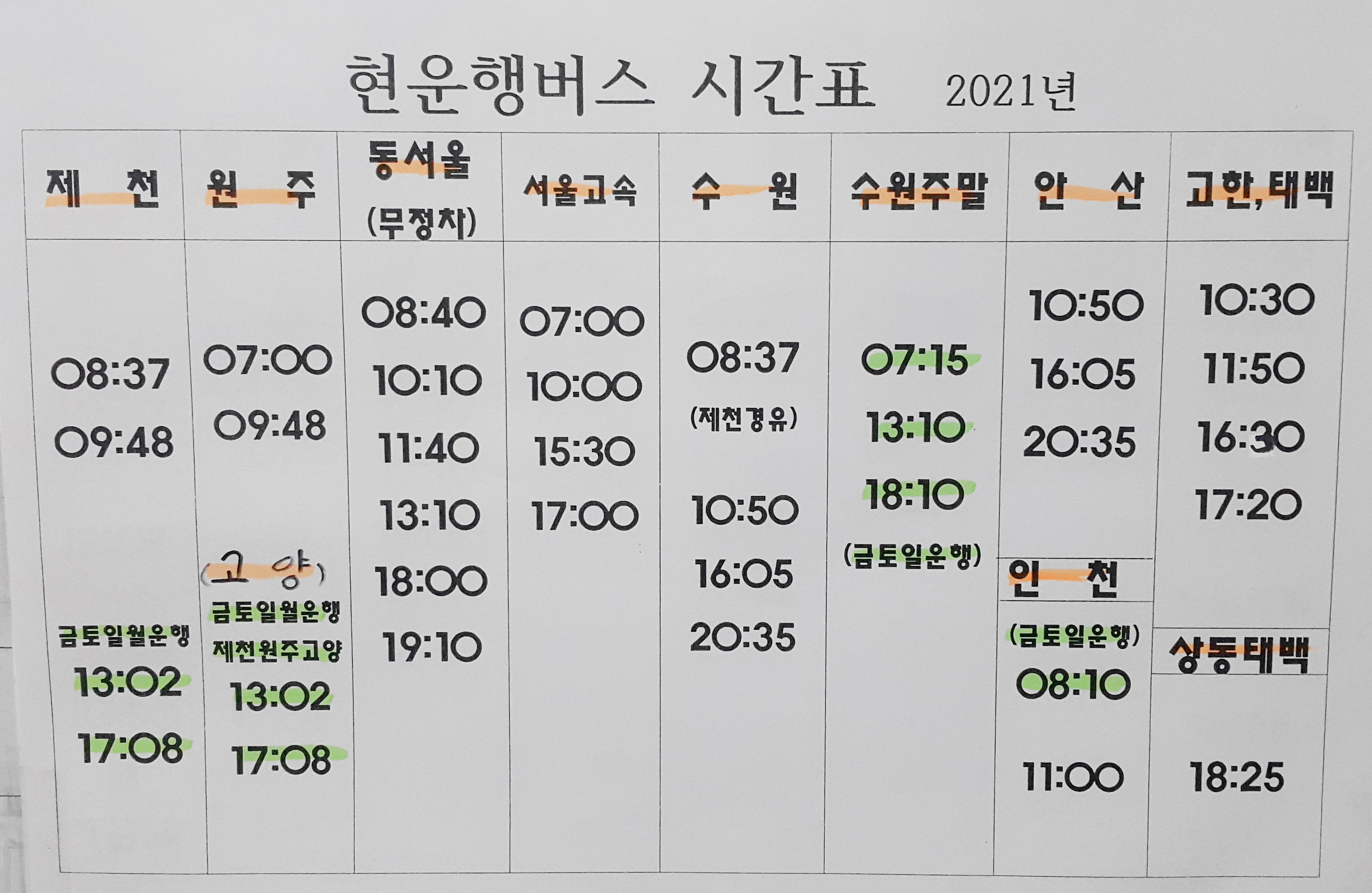 영월 출발 동서울, 강남, 수원, 인천, 안산 방면.