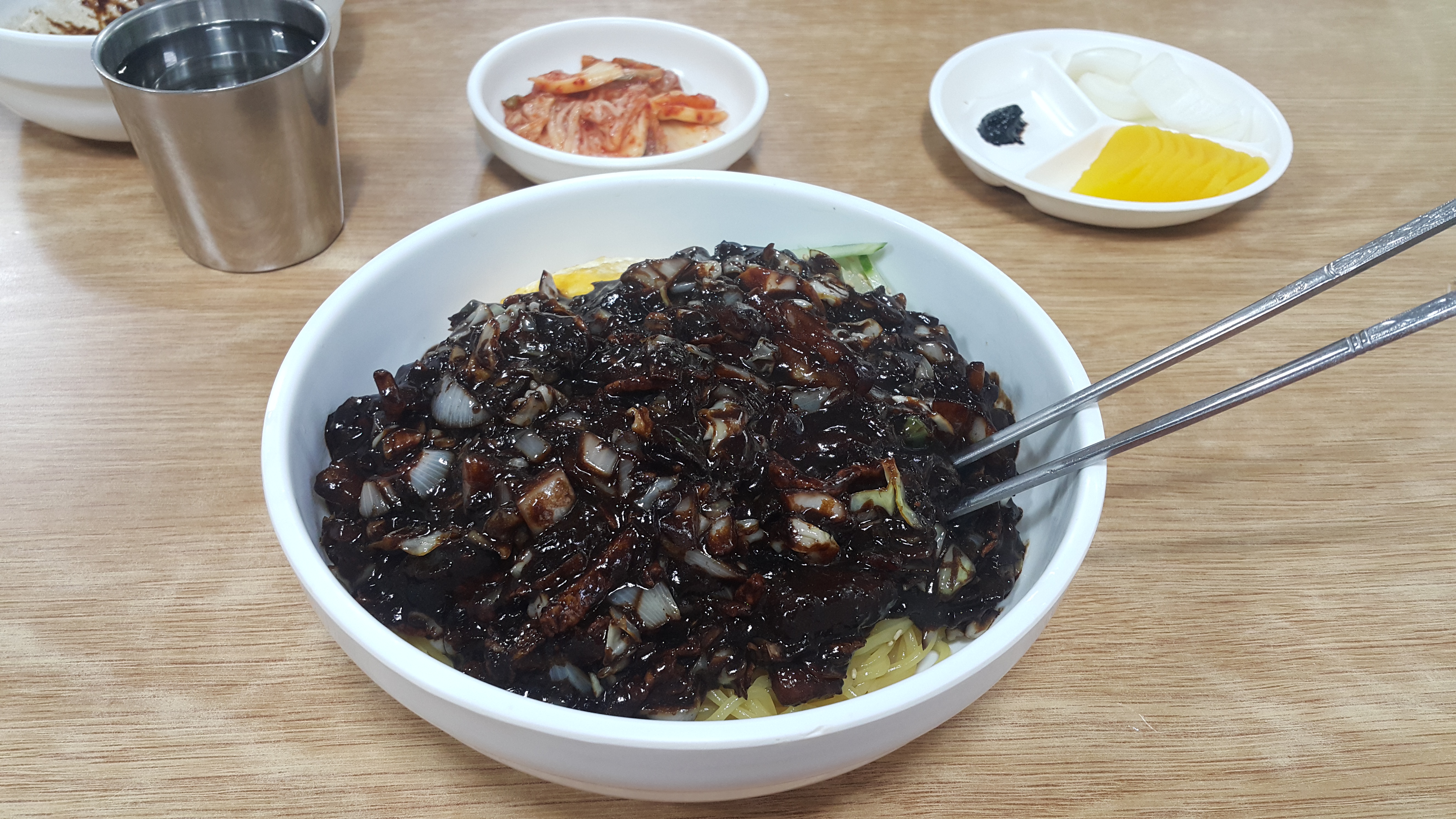 간짜장을 주문하였는데 물을 스텐컵 가득히 넘칠 것같이 내어오셨고