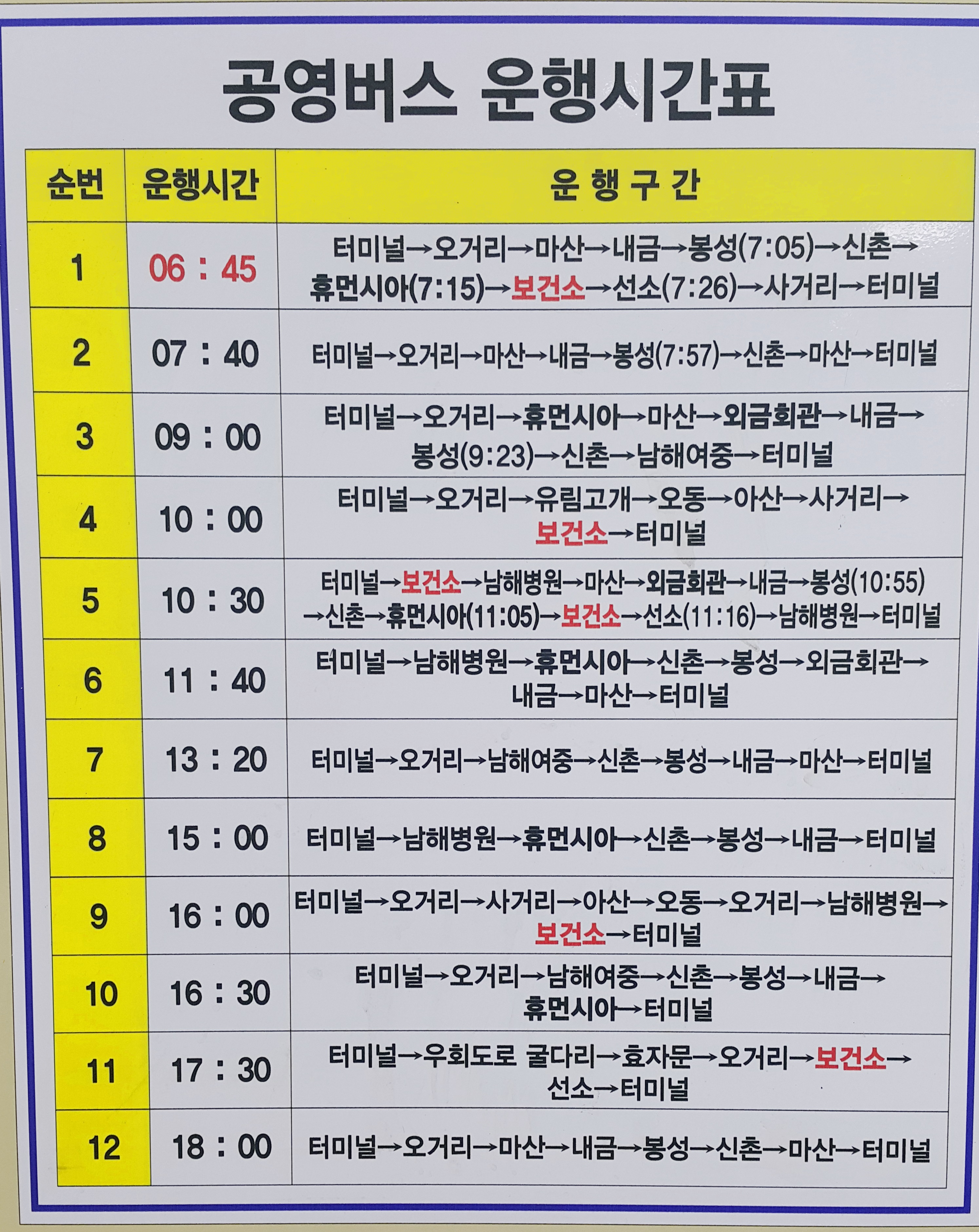 남해 시내버스 뚜벅이 (공용3호) 버스운행시간표