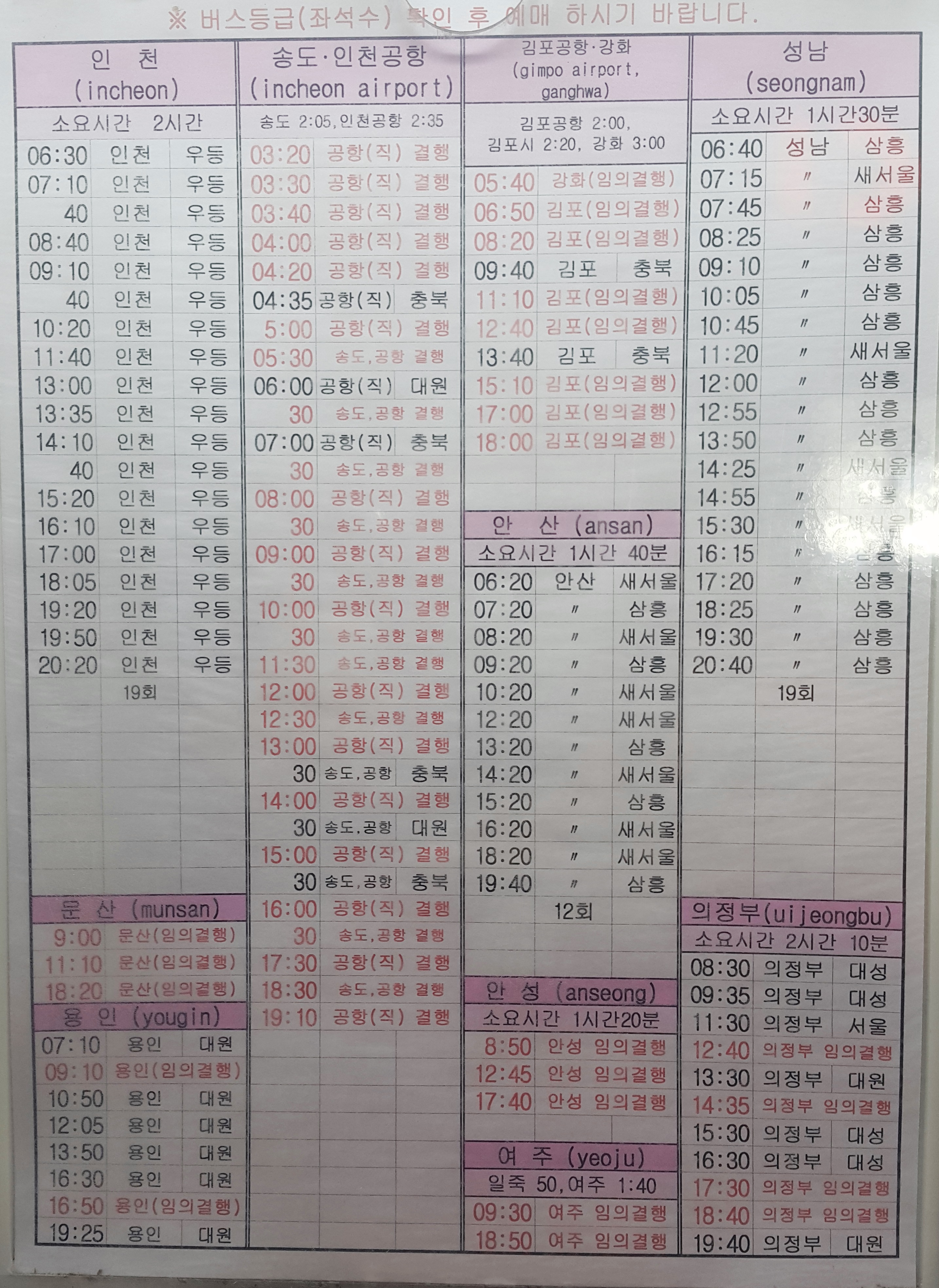 청주시외버스터미널 출발 인천, 송도, 인천공항, 김포공항, 강화, 성남, 문산, 용인, 안산, 안성, 여주, 의정부 방면.