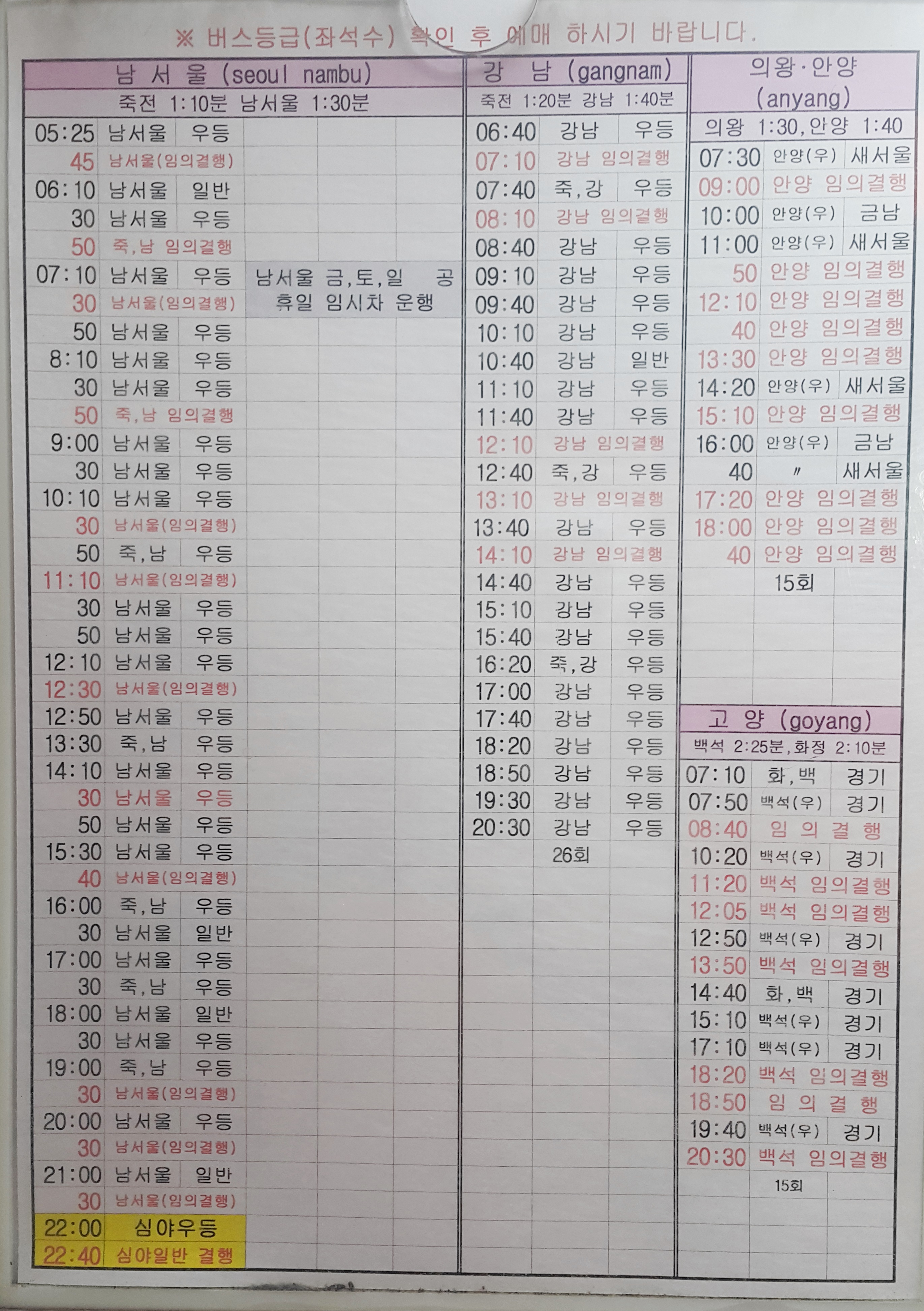 청주시외버스터미널 출발 남서울, 강남, 의왕, 안양, 고양 방면.