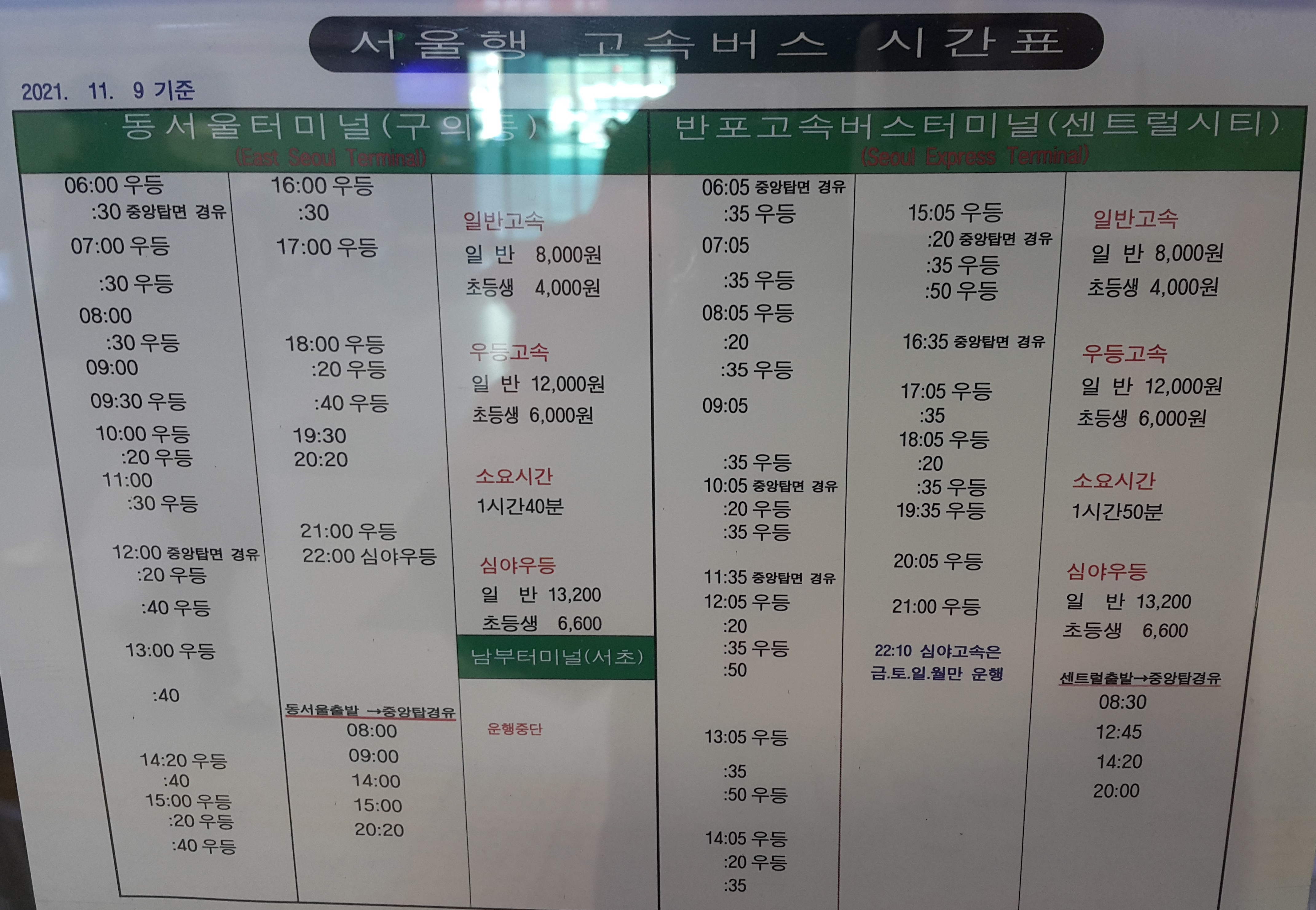 충주 출발 서울, 동서울터미널, 반포고속버스터미널 방면.
