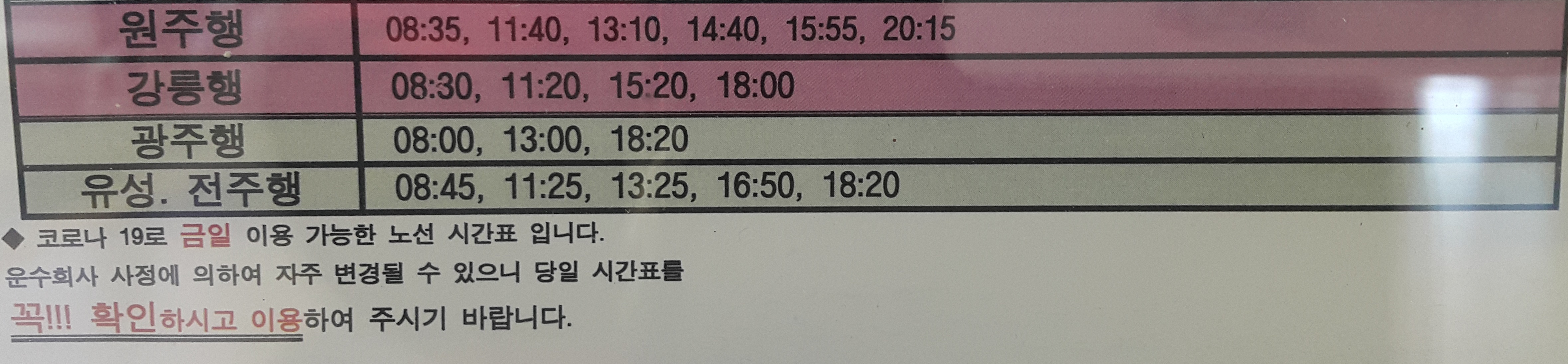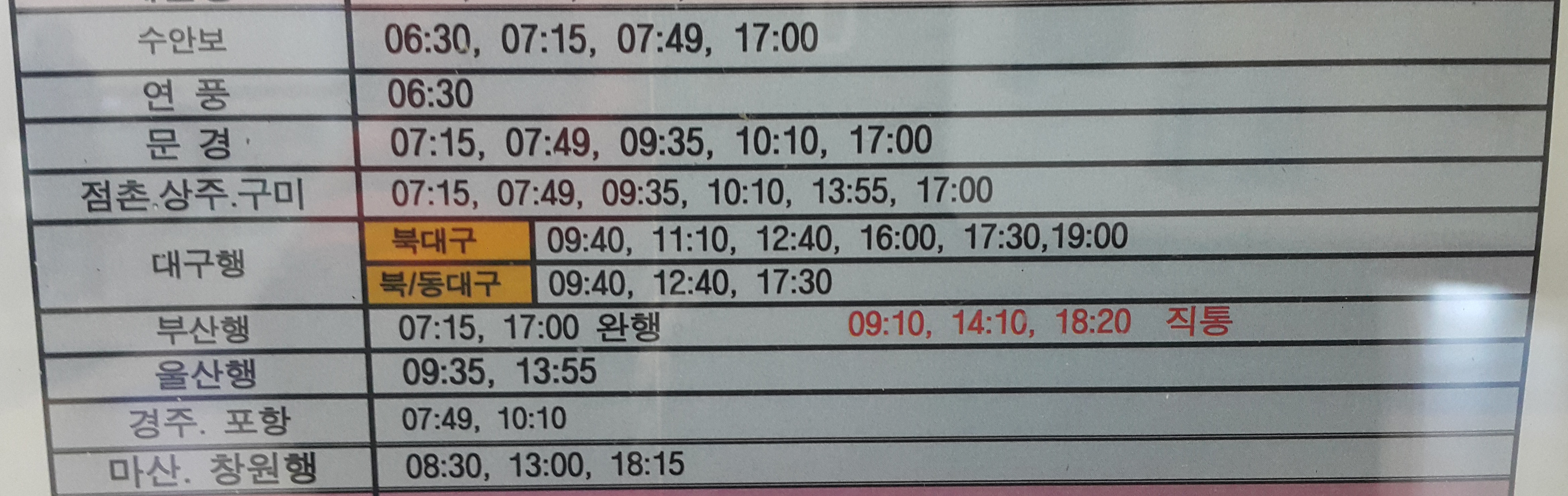 충주 충발 원주, 강릉, 광주, 유성, 전주 방면.