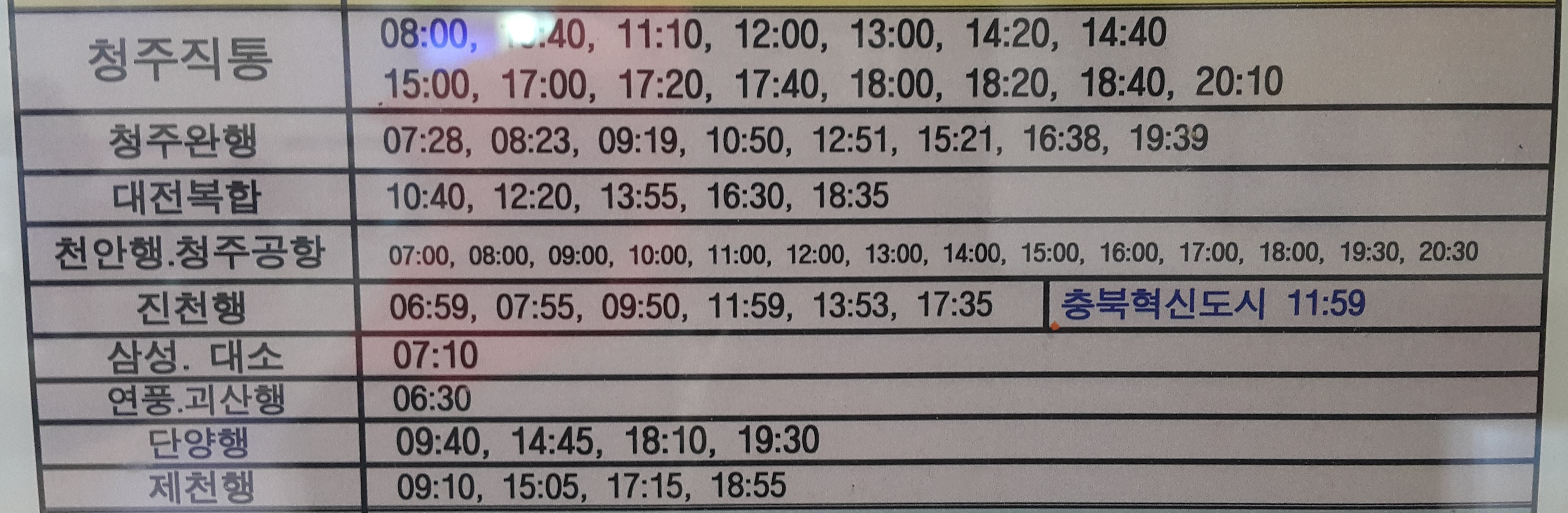 충주 출발 청주, 대전복합, 천안, 청주공항, 진천, 삼성, 대소, 연풍, 괴산, 단양, 제천 방면.