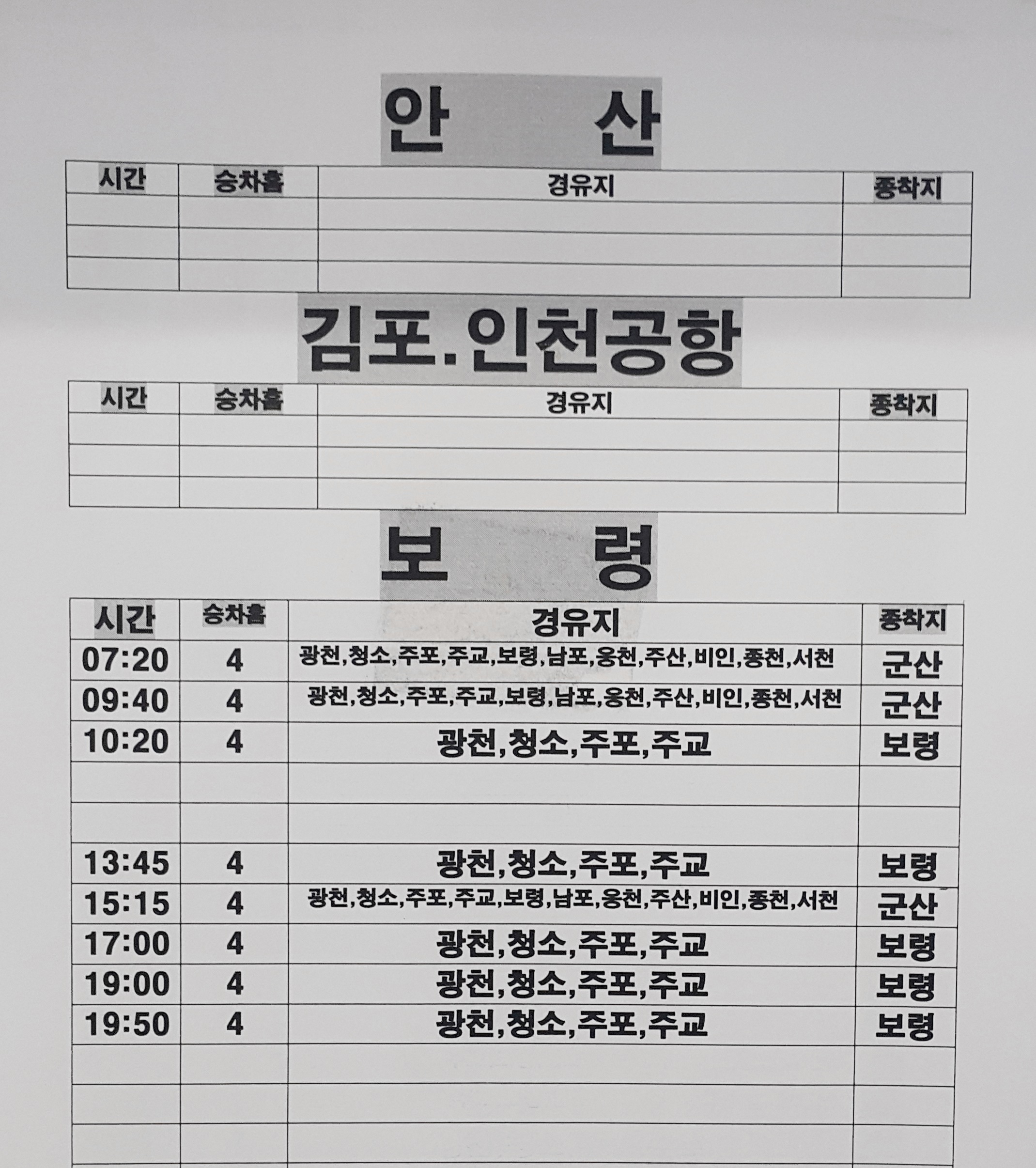 홍성 출발 안산, 김포, 인천공항, 보령 방면.