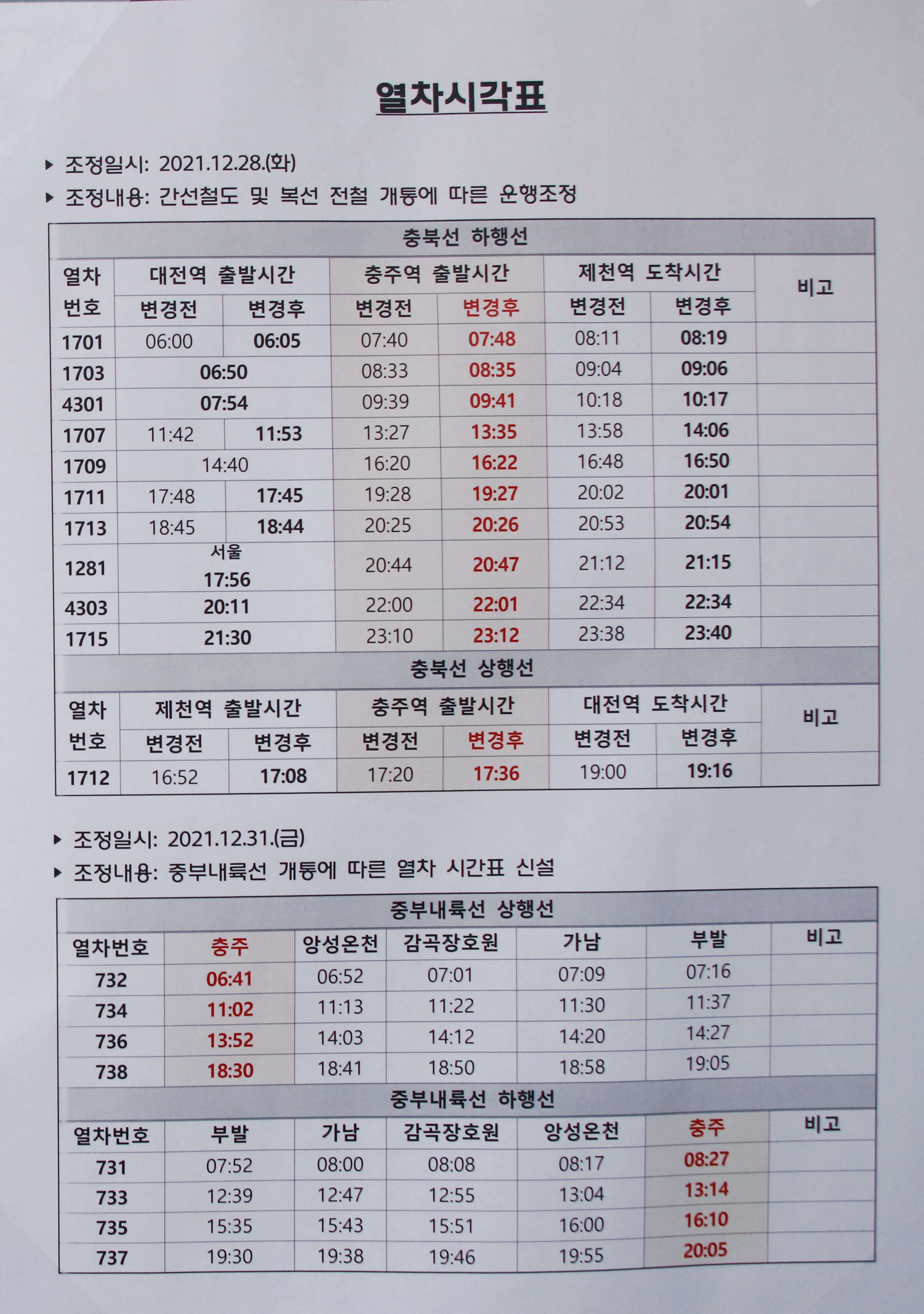 중부내륙선 부발~충주, 중앙성 영천~신경주, 동해선 일광~태화강~포항, 대구선 동대구~영천 복선 전철 개통에 따라