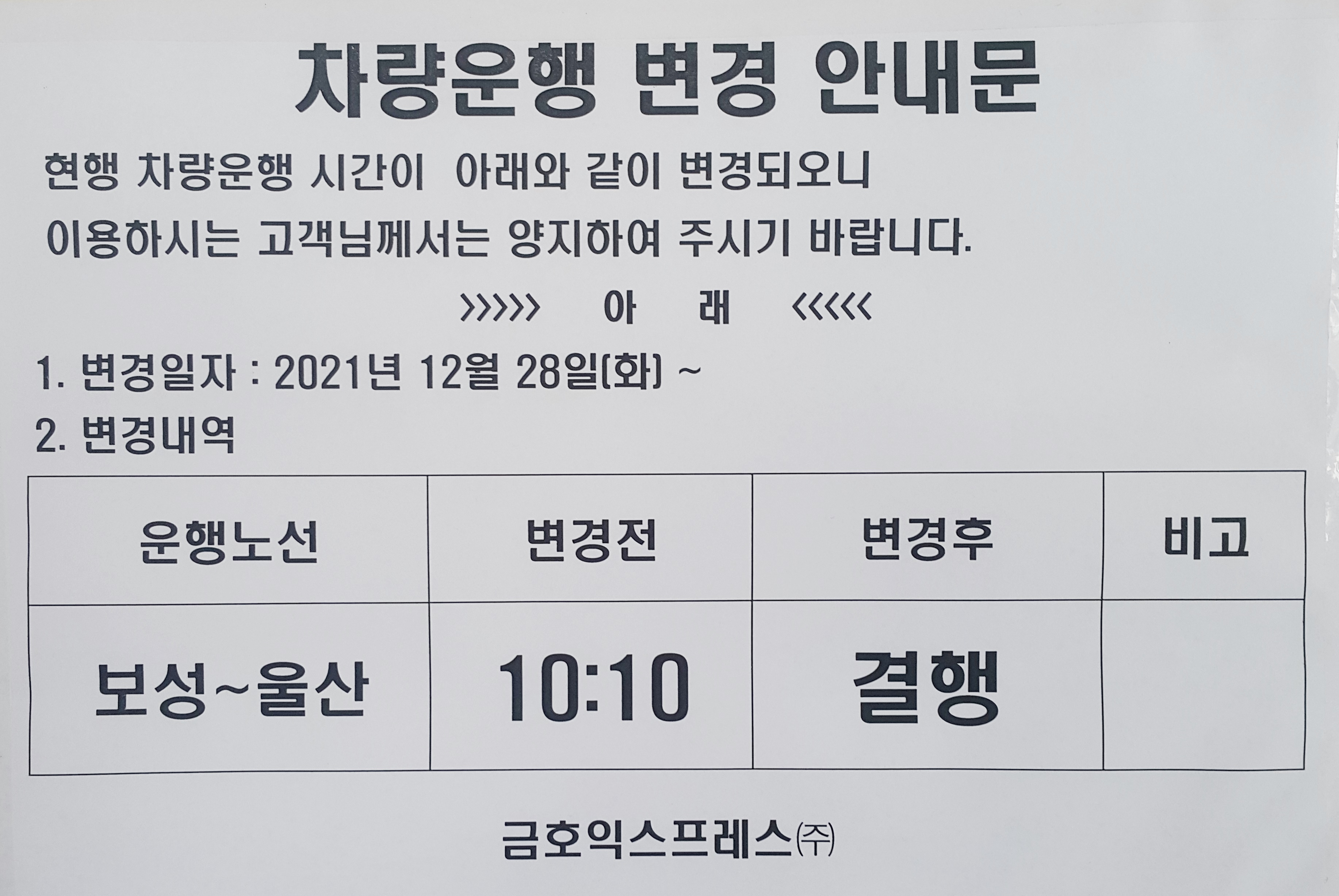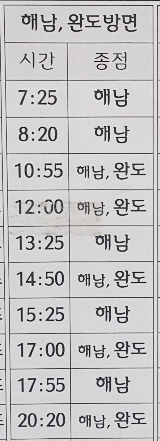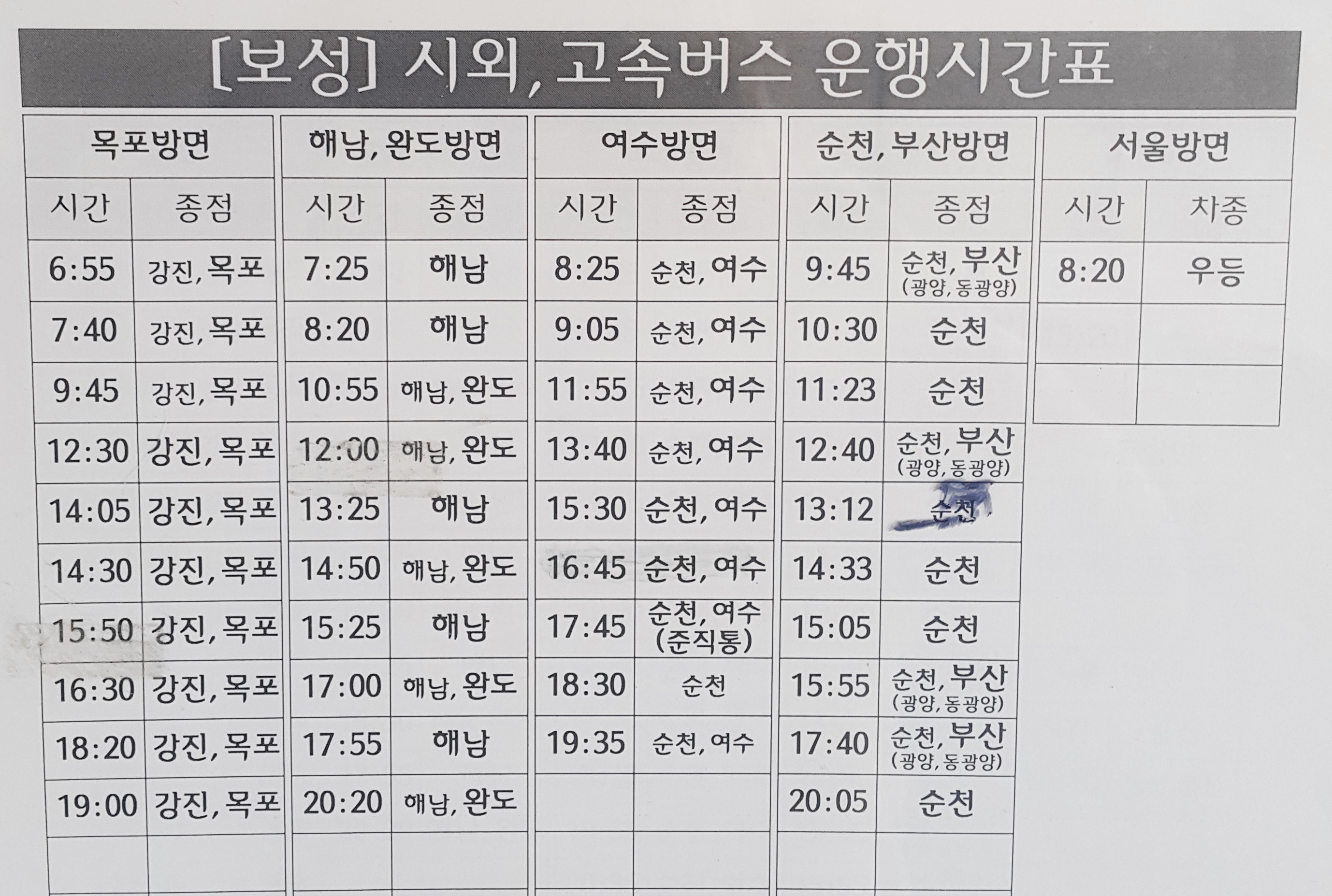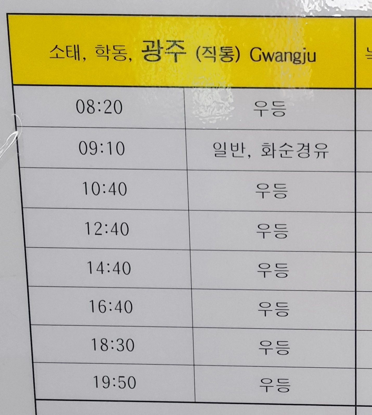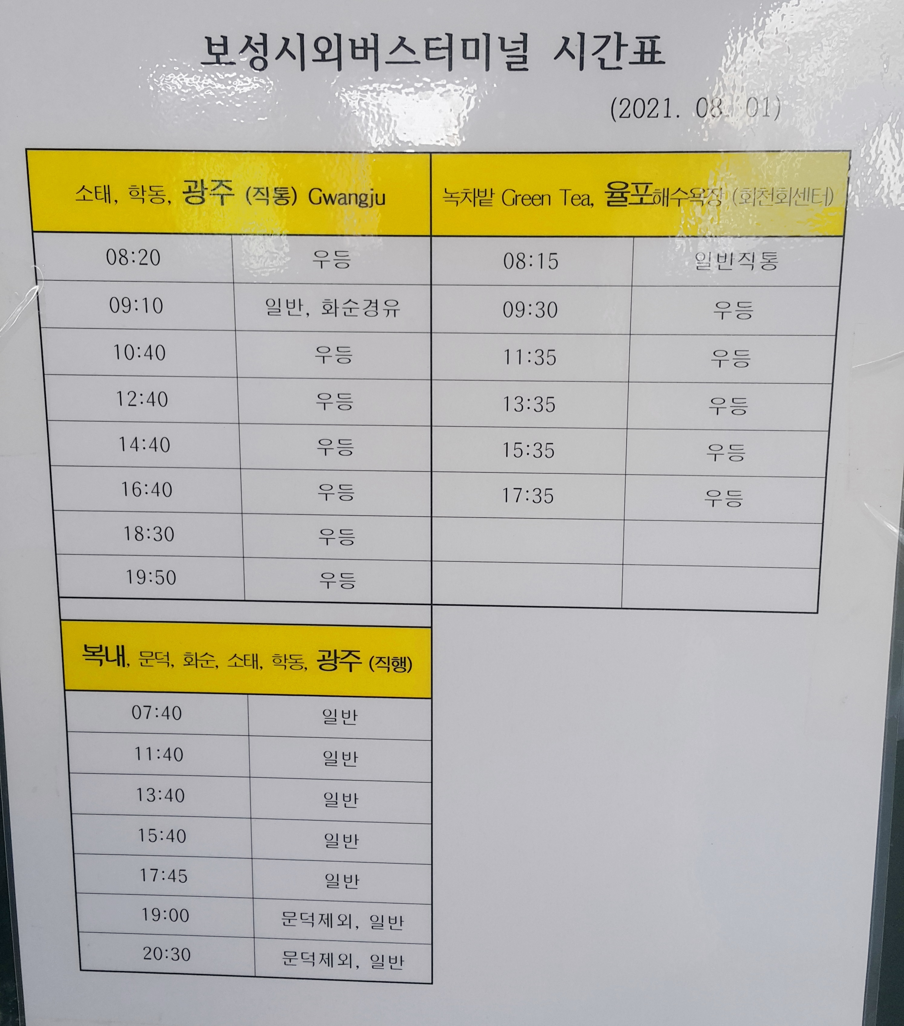 보성 출발 복내, 문덕, 화순, 소태, 학동, 광주 방면.