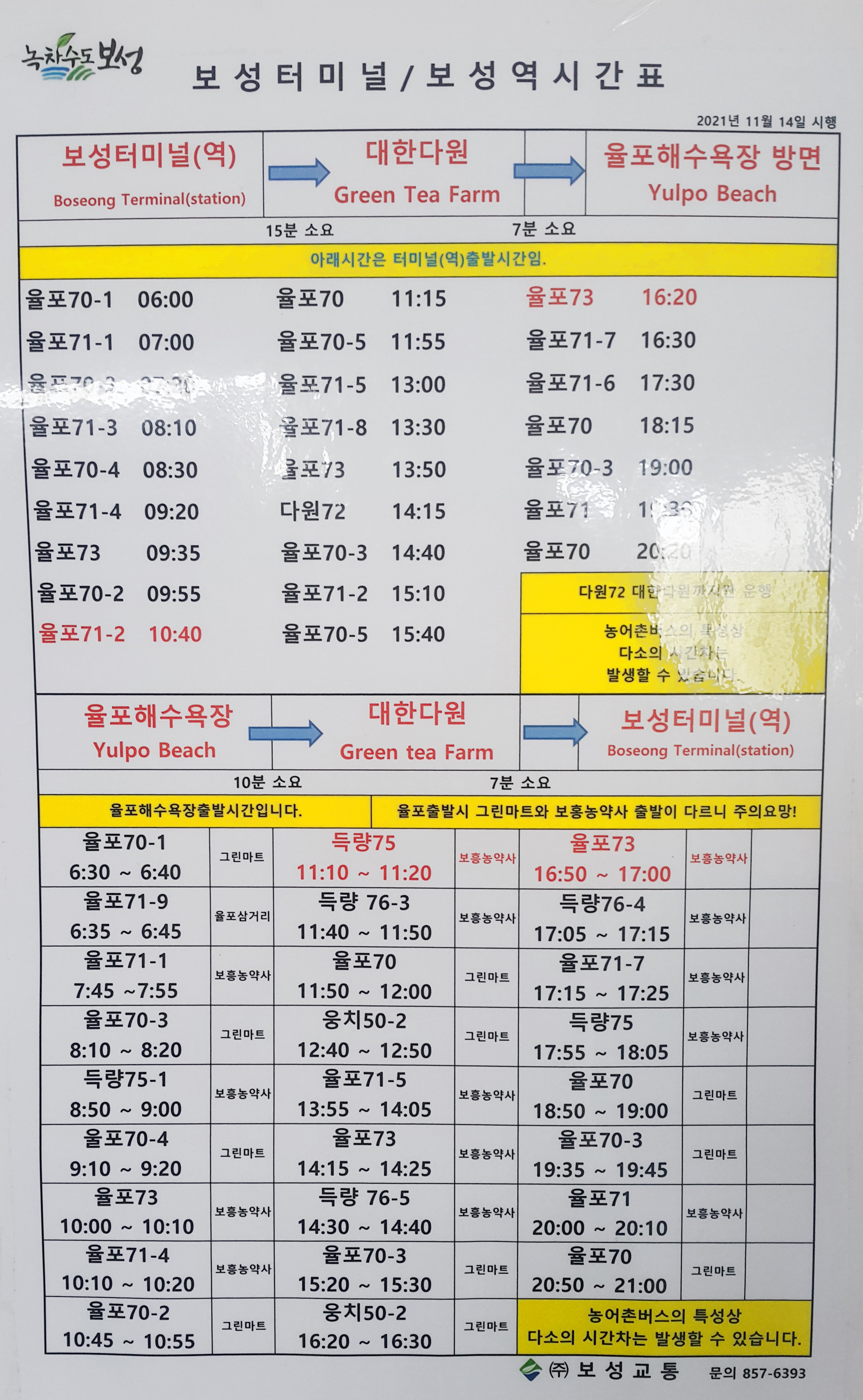 보성 출발 녹차밭, 율포해수옥장, 회천회센터 방면.