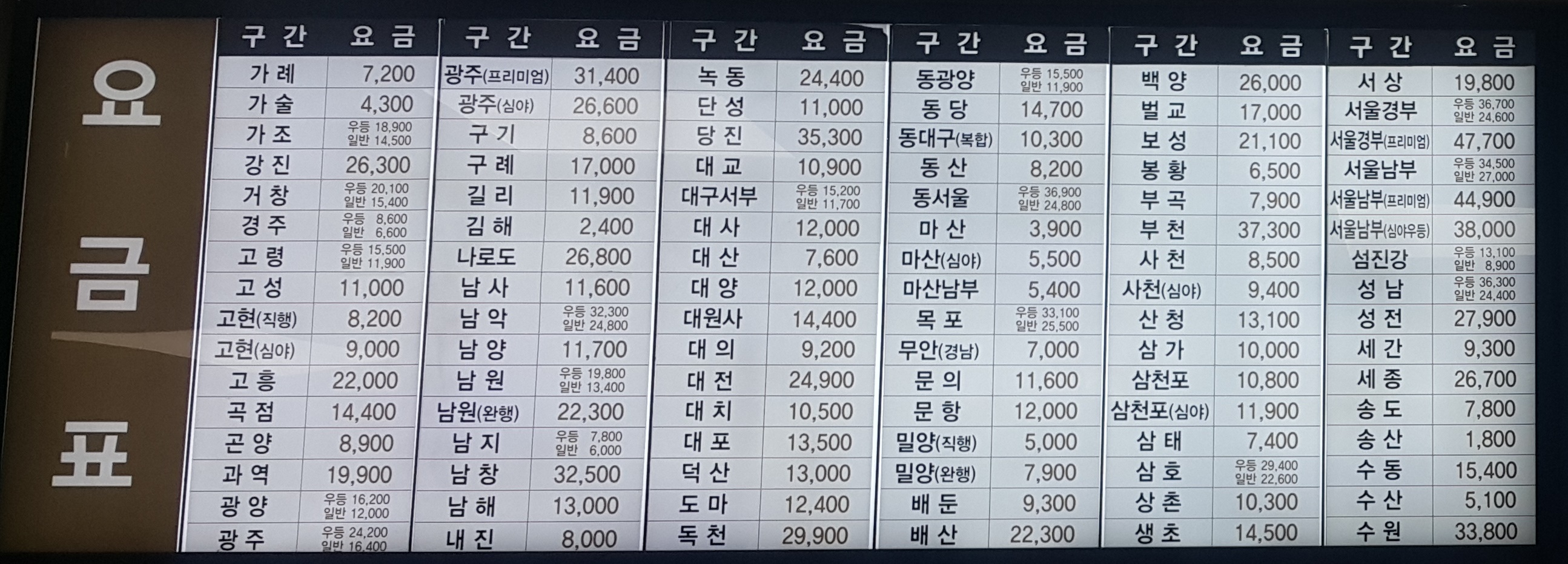 부산 사상시외버스터미널 시외버스 요금표