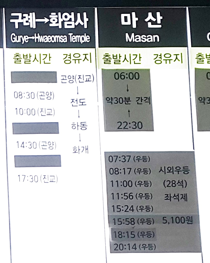 부산 사상 출발 구례, 화엄사, 마산 방면.