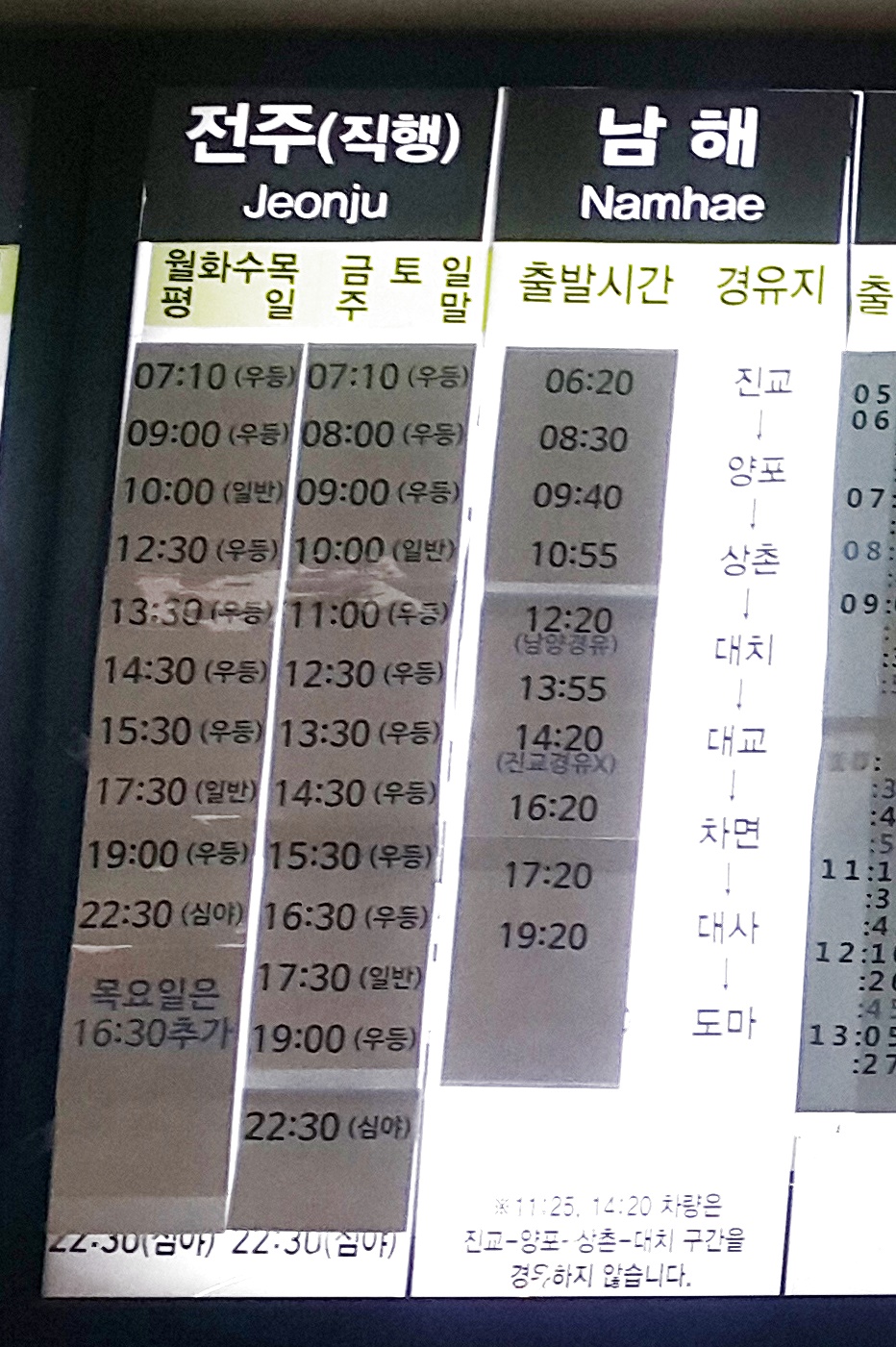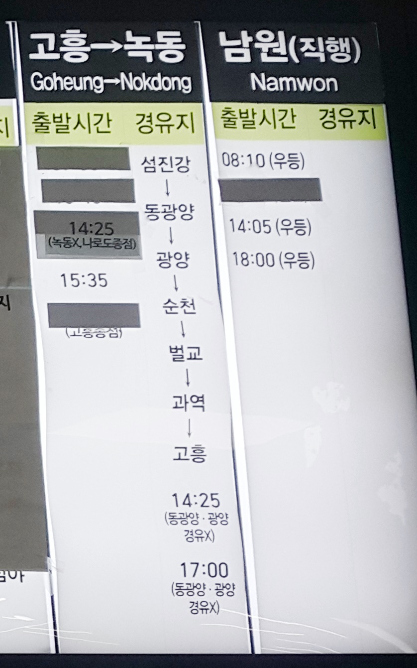 부산 사상 출발 고흥, 녹동, 남원 방면.