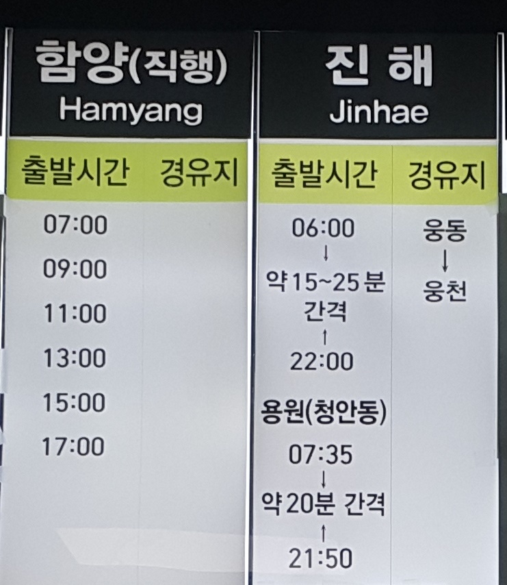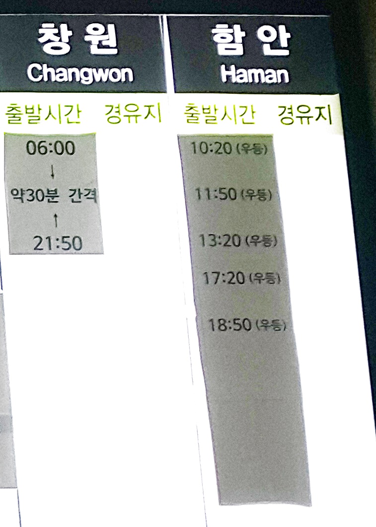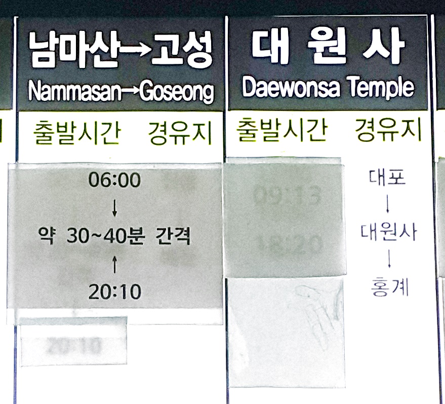 부산 사상 출발 남마산, 고성, 대원사 방면.