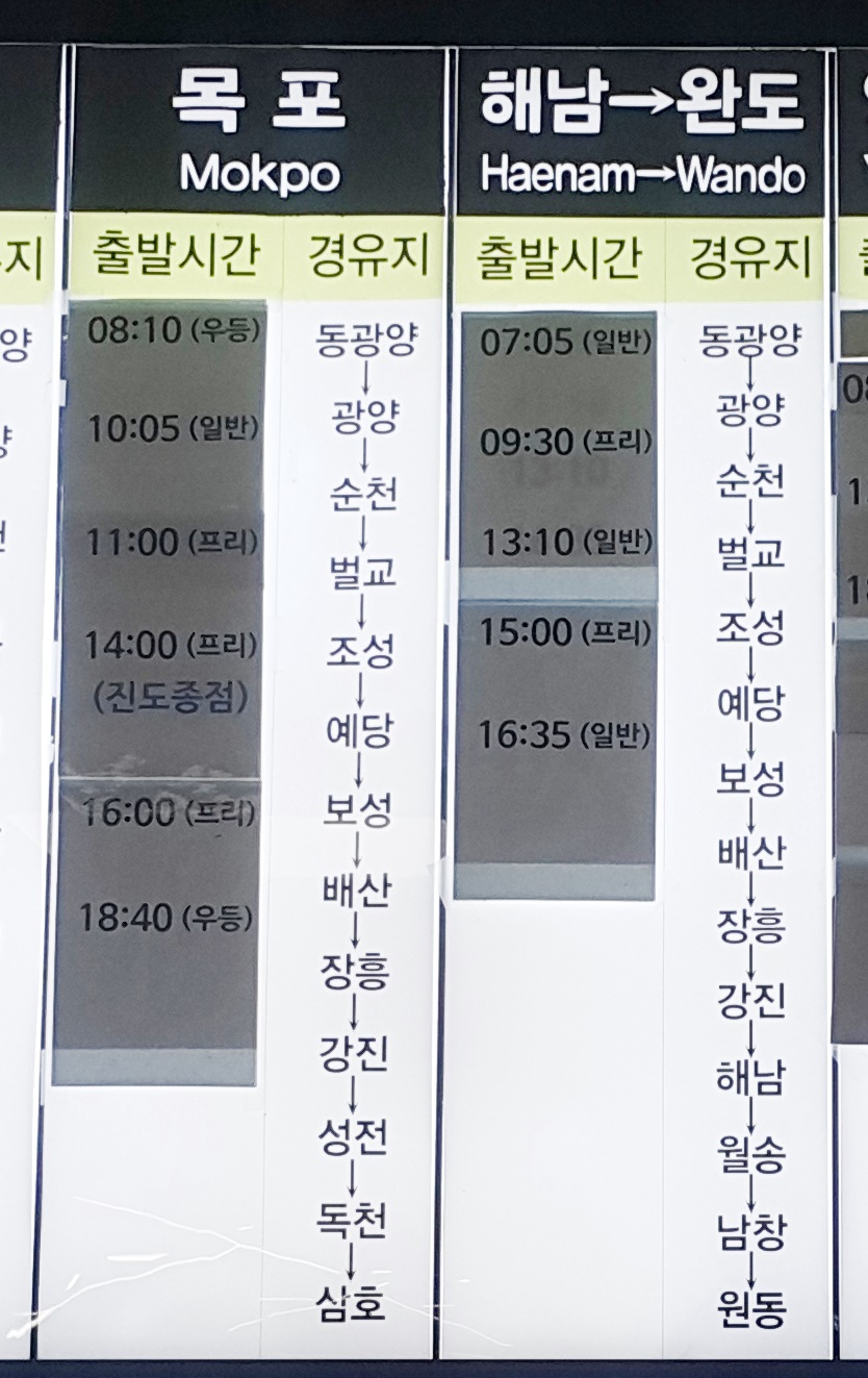부산 사상 출발 목포, 해남, 완도 방면.