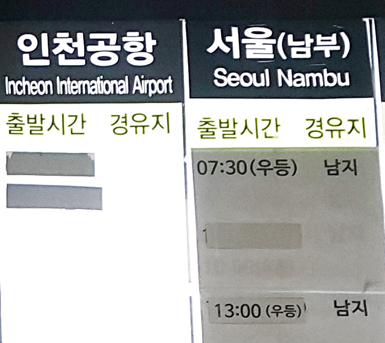 부산 사상 출발 인천공항, 서울 남부 방면.