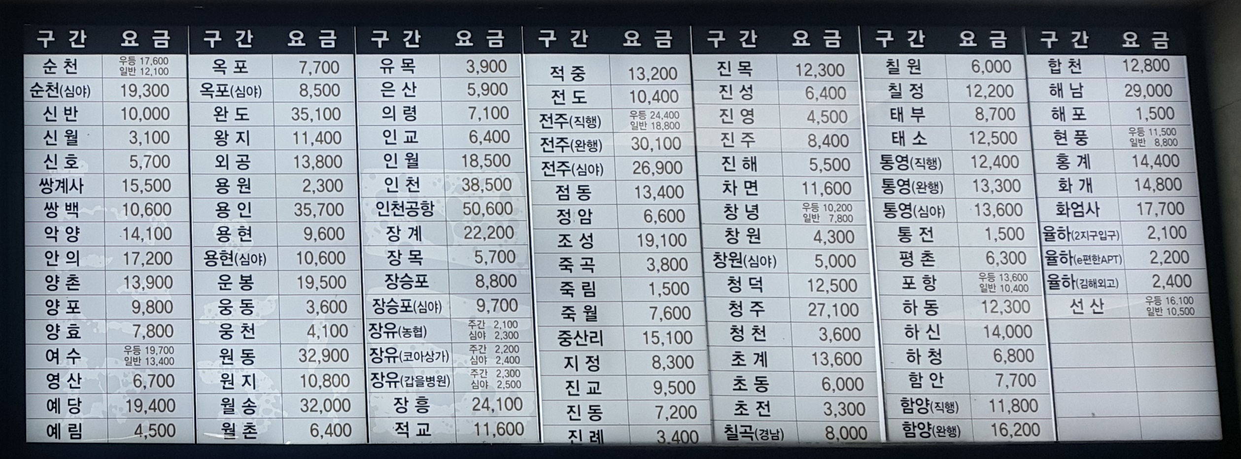 부산 사상시외버스터미널 시외버스 요금표