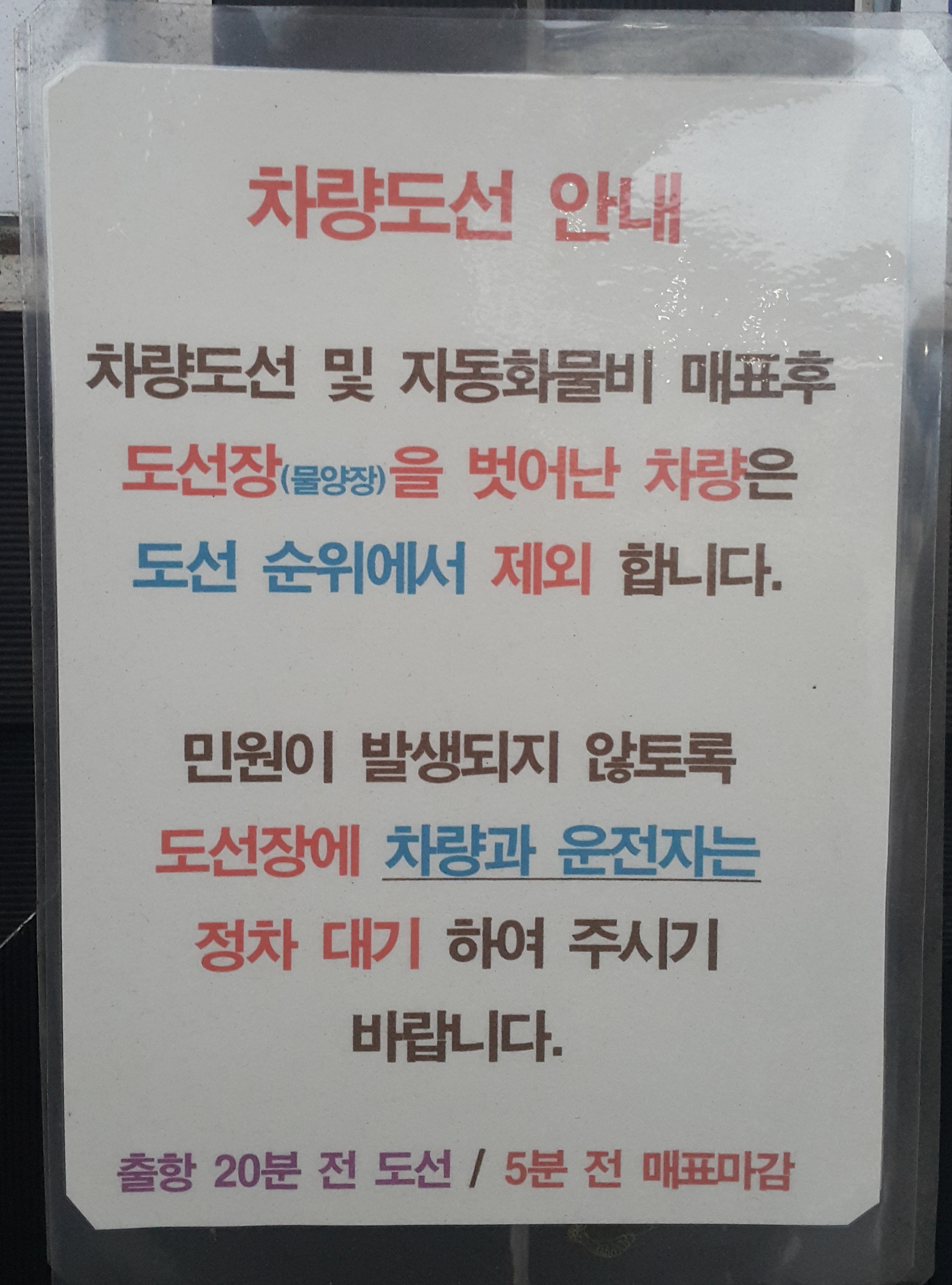 차량도선 및 자동화몰비 매표 후 도선장(물양장)을 벗어난 차량은 도선 순위에서 제외합니다.