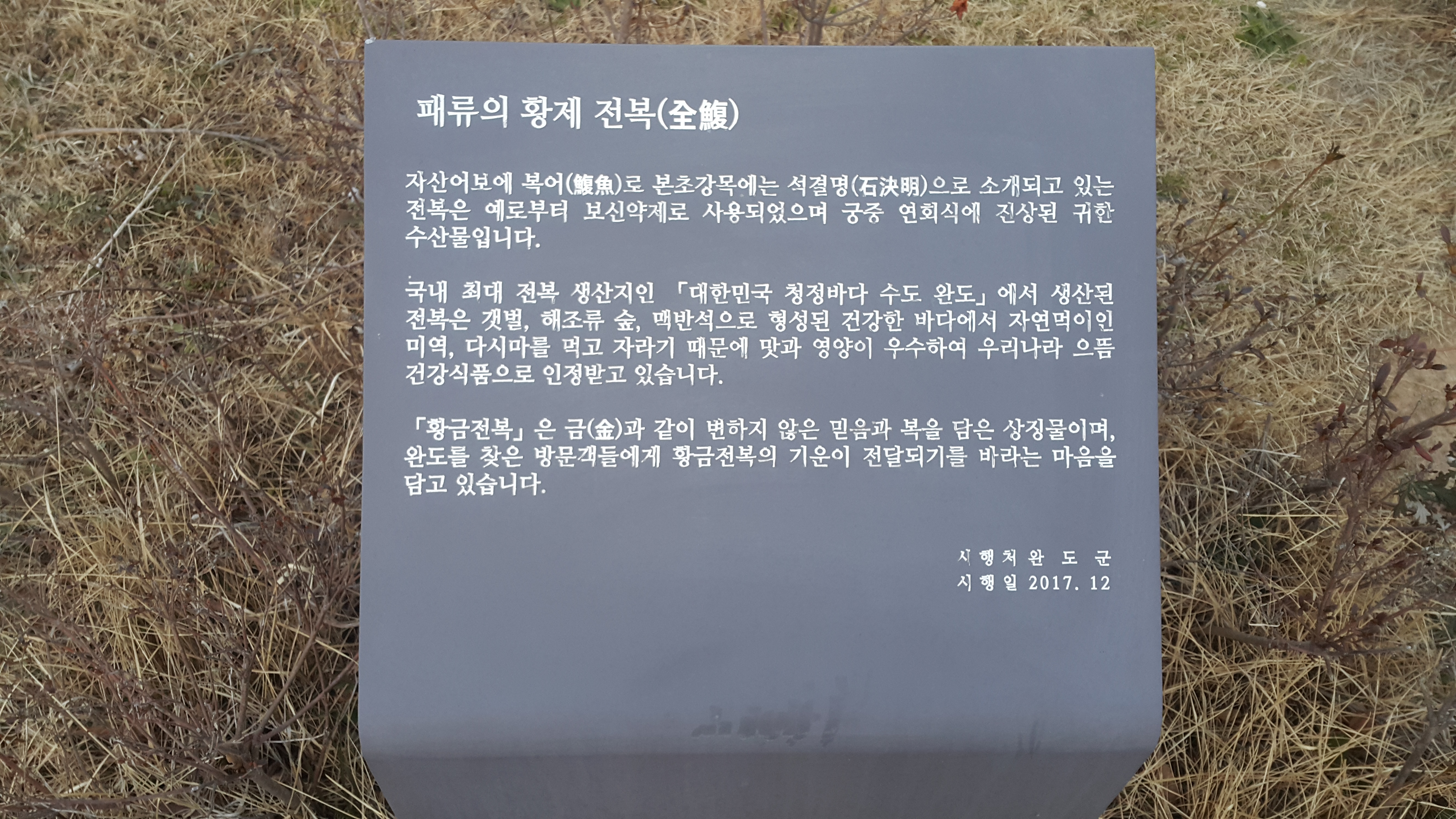 황금전복은 금과 같이 변하지 않은 믿음과 복을 담은 상징물이며, 완도를 찾은 방문객들에게 황금전복의 기운이 전달되기를 바라는 마음을 담고 있습니다.