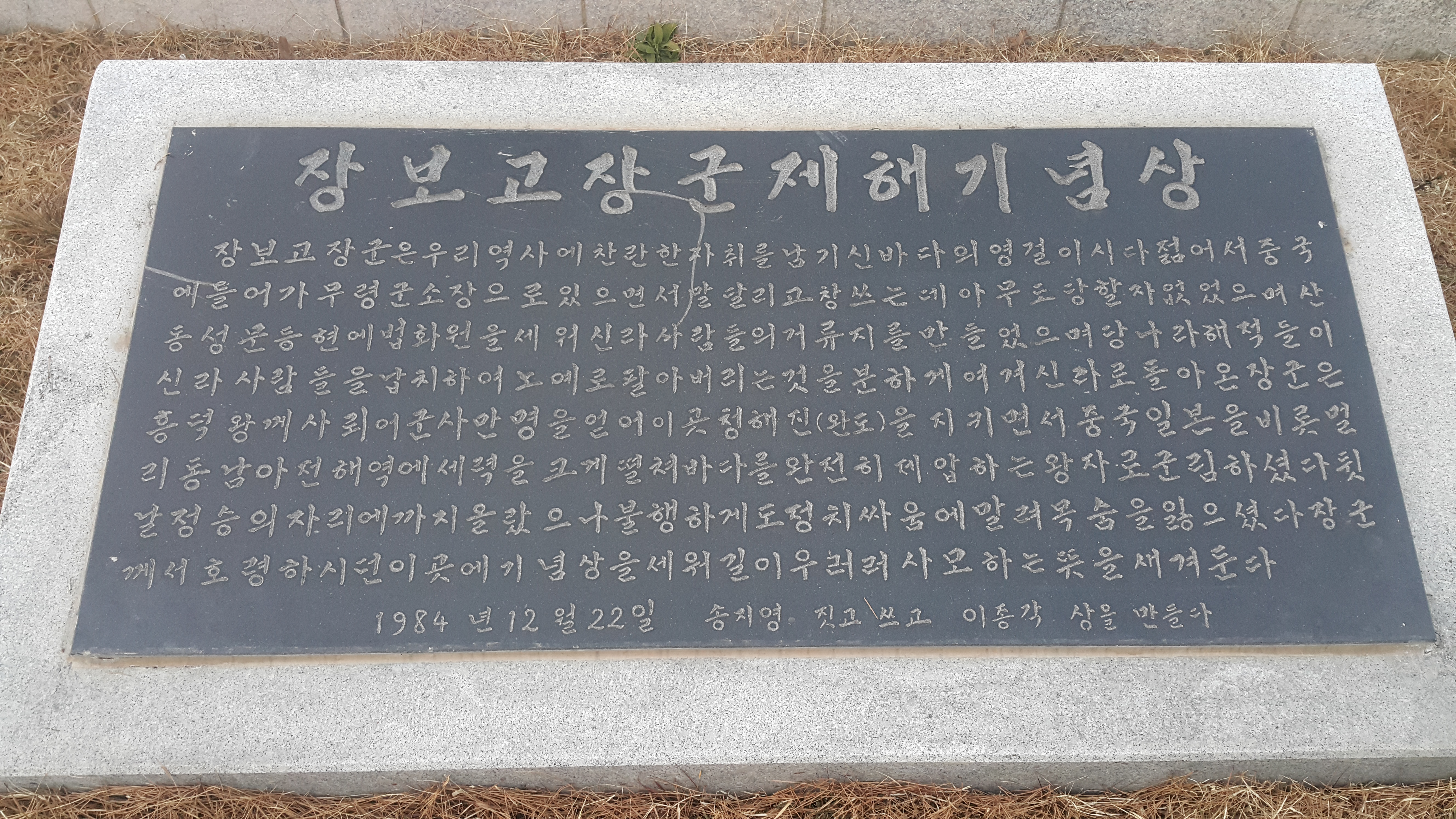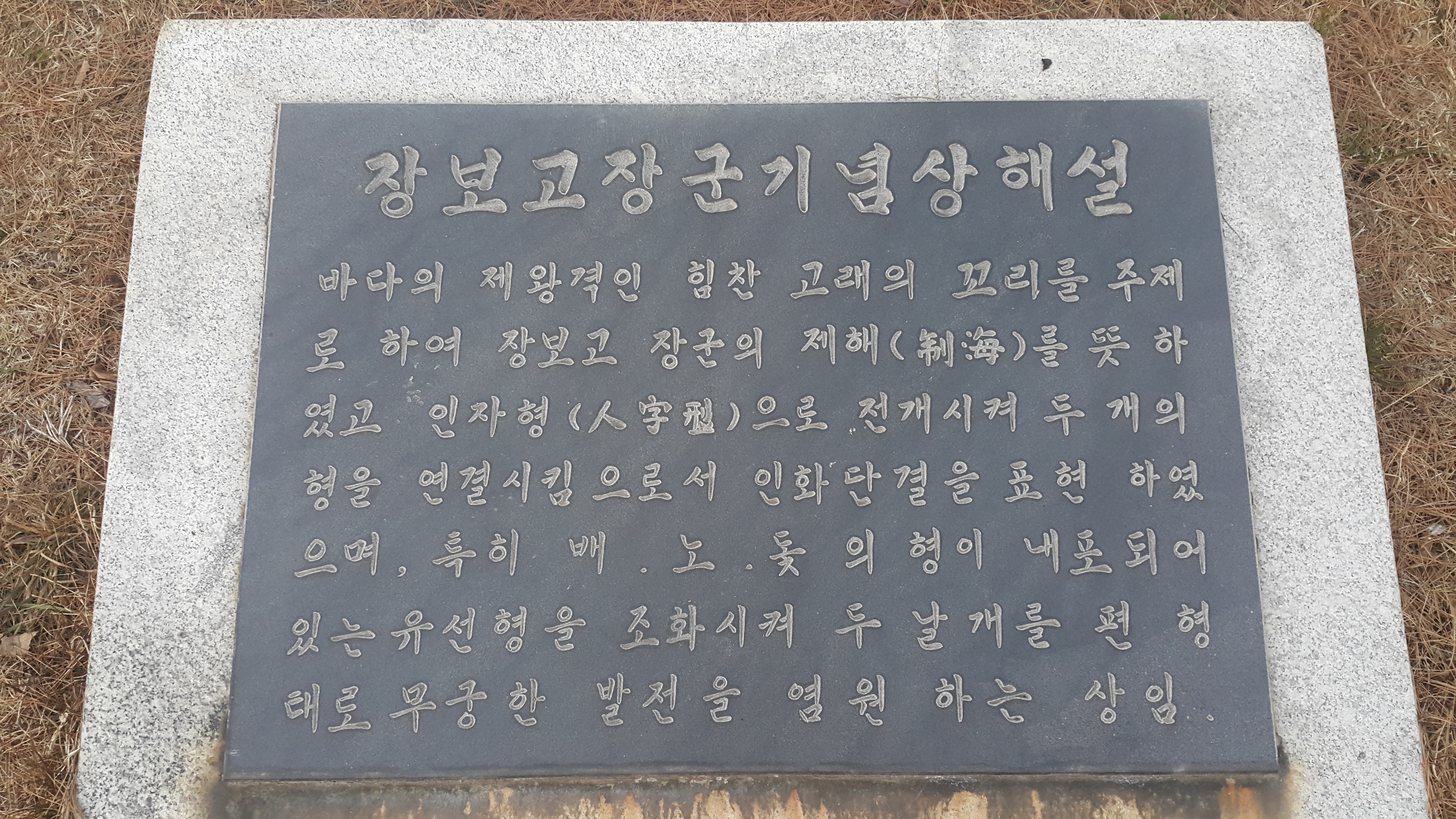 장보고 장군은 우리 역사에 찬란한 자취를 남기신 바다의 명걸이시다. 젊어서 중국에 들어가 무령군 소장으로 있으면서 말달리고 창 쓰는데 아무도 당할 자 없었으며 산동성 문동현에 법화원을 세워 신라사람들의 거류지를 만들었으며 당나라 해적들이 신라사람들을 납치하여 노예로 팔아버리는 것을 분하게 여겨 신라로 돌아온 장군은 흥덕왕께 사뢰어 군사만명을 얻어 이곳 청해진(완도)을 지키면서 중국, 일본을 비롯 멀리 동남아 전해역에 세력을 크게 펼쳐 바다를 완전히 제압한 왕자로 군림하셨다 뒷날 정승의 자리에까지 올라갔으나 불행하게도 정치싸움에 말려 목숨을 일으셨다, 장군께서 호령하시던 이곳에서 기념상을 세워 길이 우러러 사모하는 뜻을 새겨둔다. 1984년 12월 22일 송지영 짓고 쓱 이종각 상을 만들다.