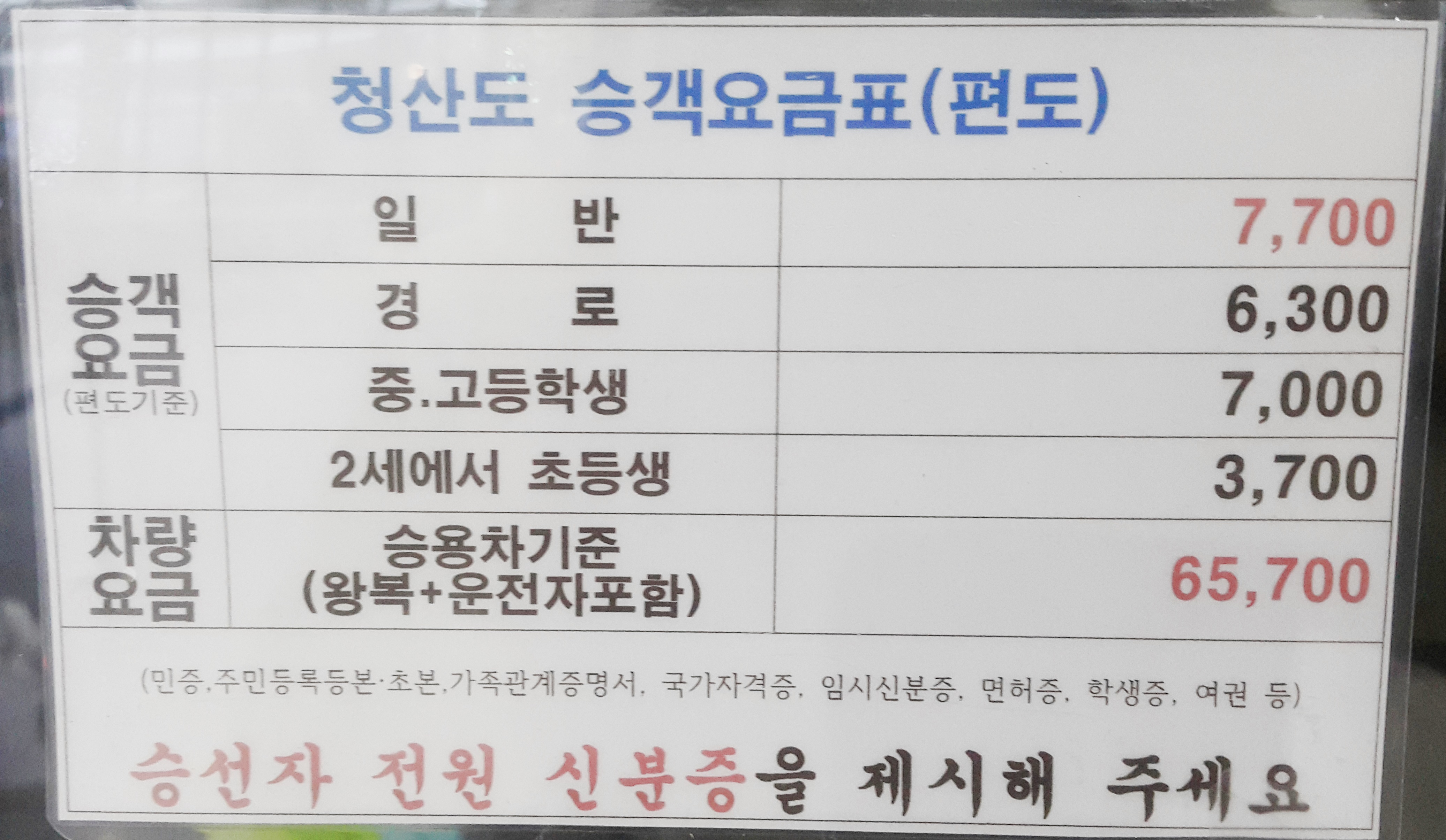 청산도 승객요금표(편도)