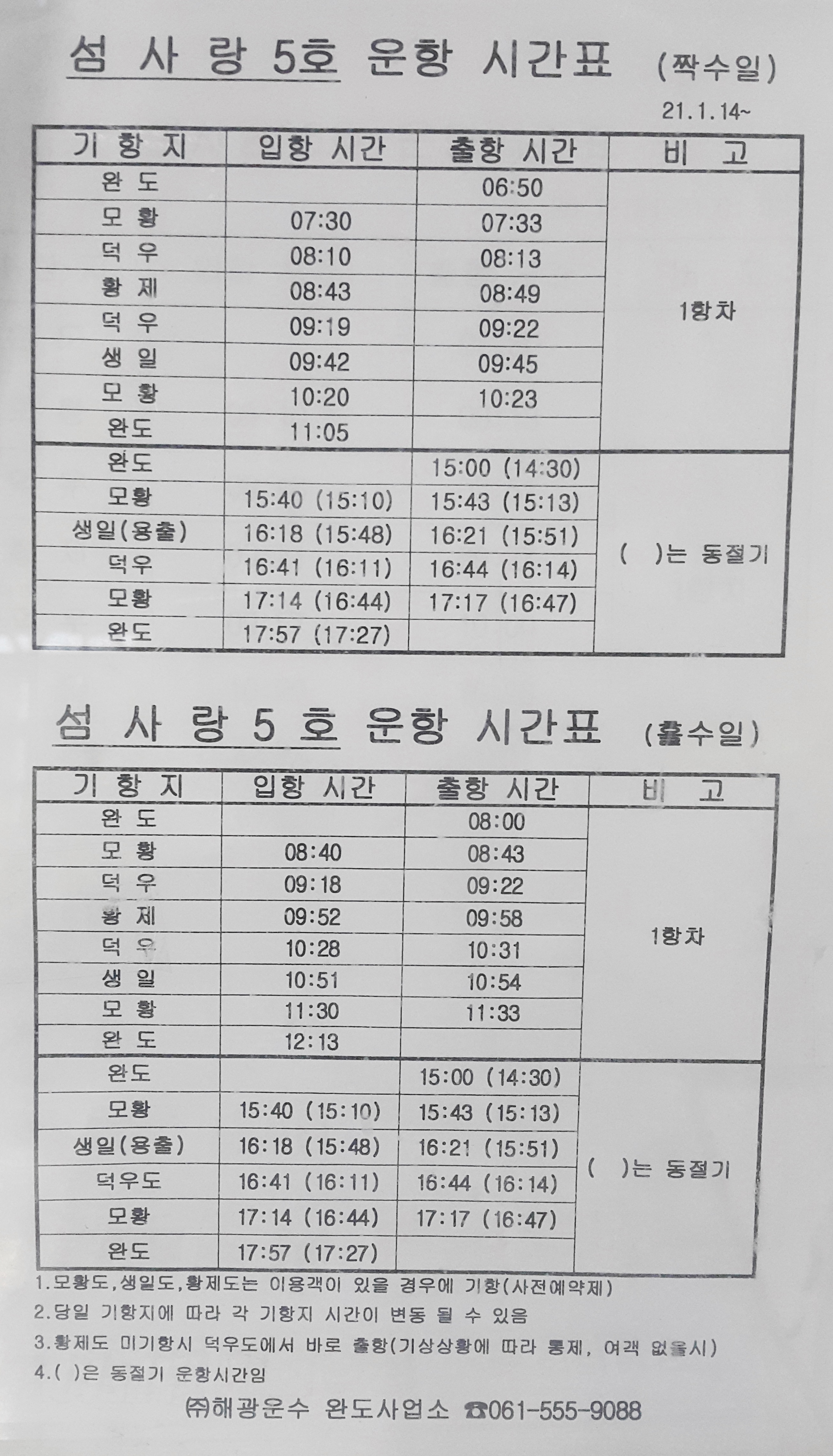 섬사랑 5호 운항 시간표(짝수일)