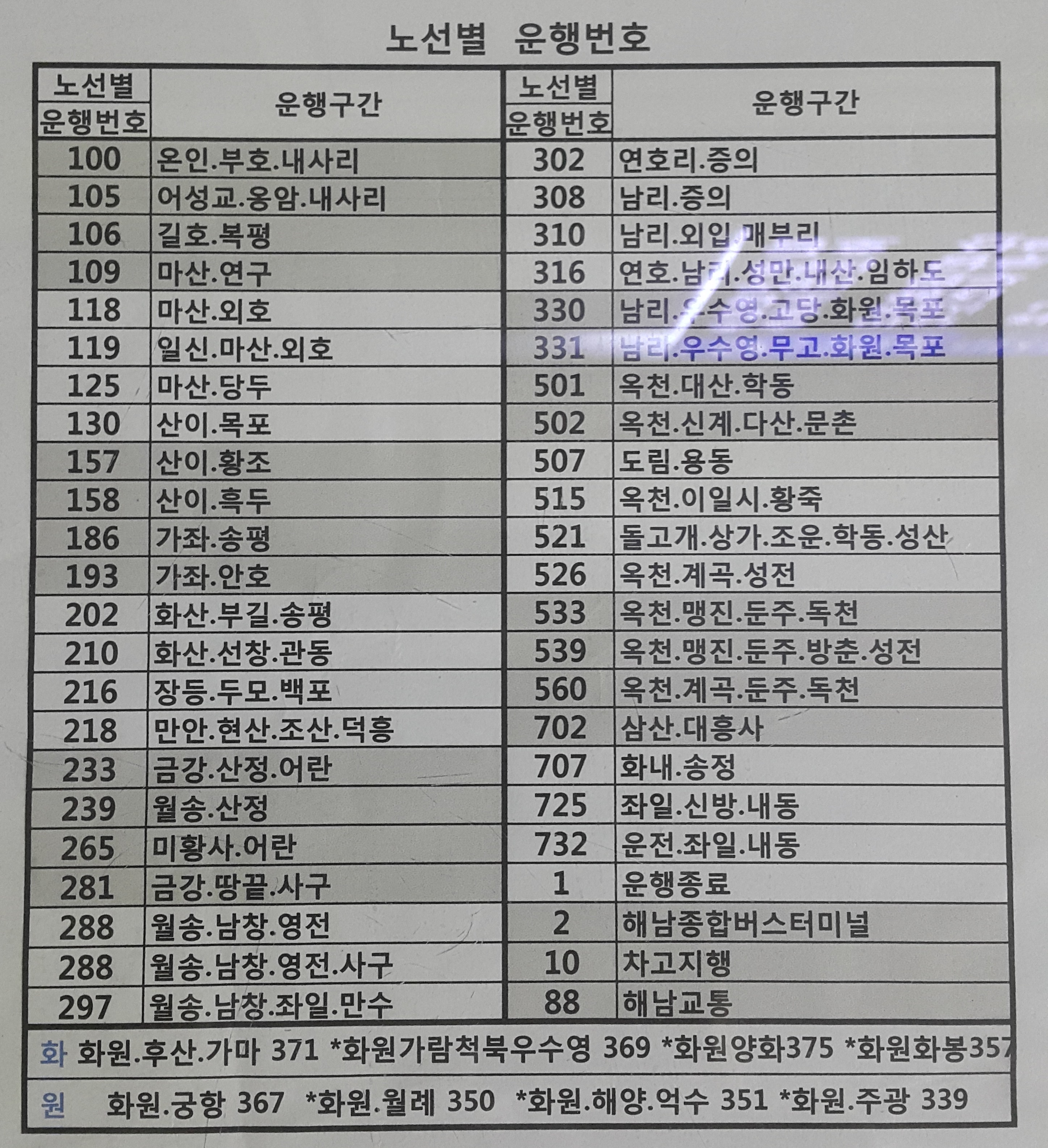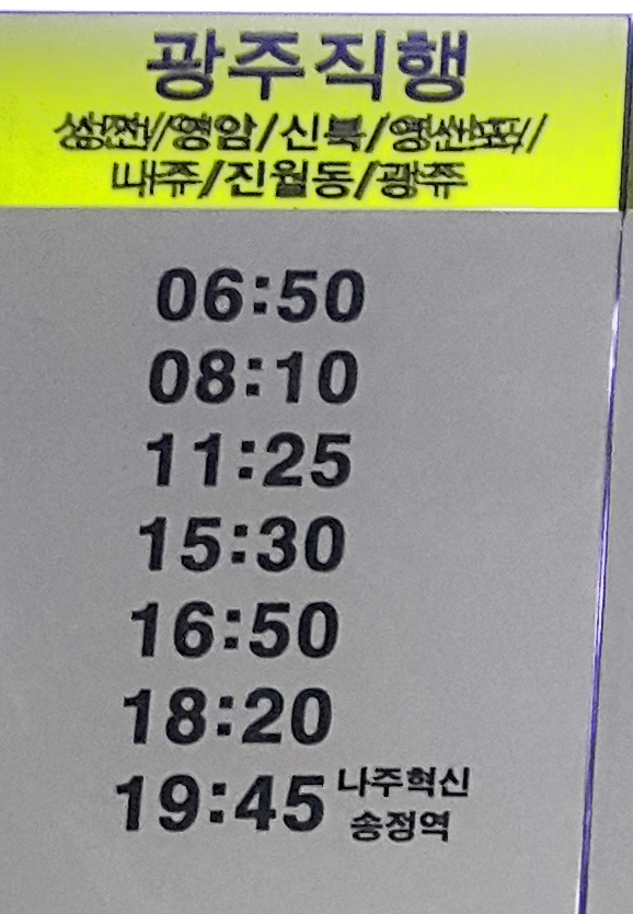 해남 출발 광주 직행, 성전, 영암, 신북, 영산포, 나주, 진월동, 광주 방면.