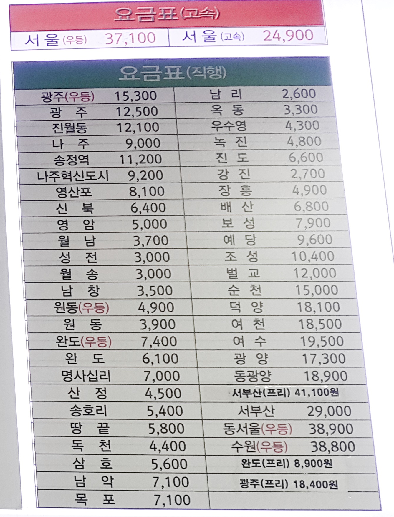 해남시외버스터미널 요금표