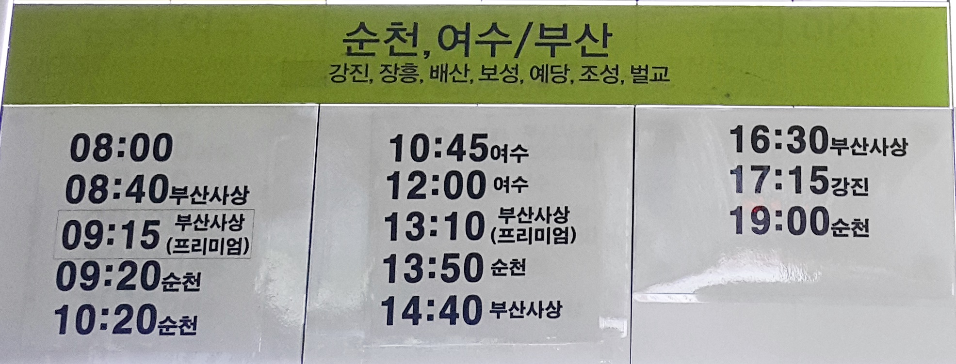 해남 출발 순천, 여수, 부산, 강진, 장흥, 배산, 보성, 예당, 조성, 벌교 방면.