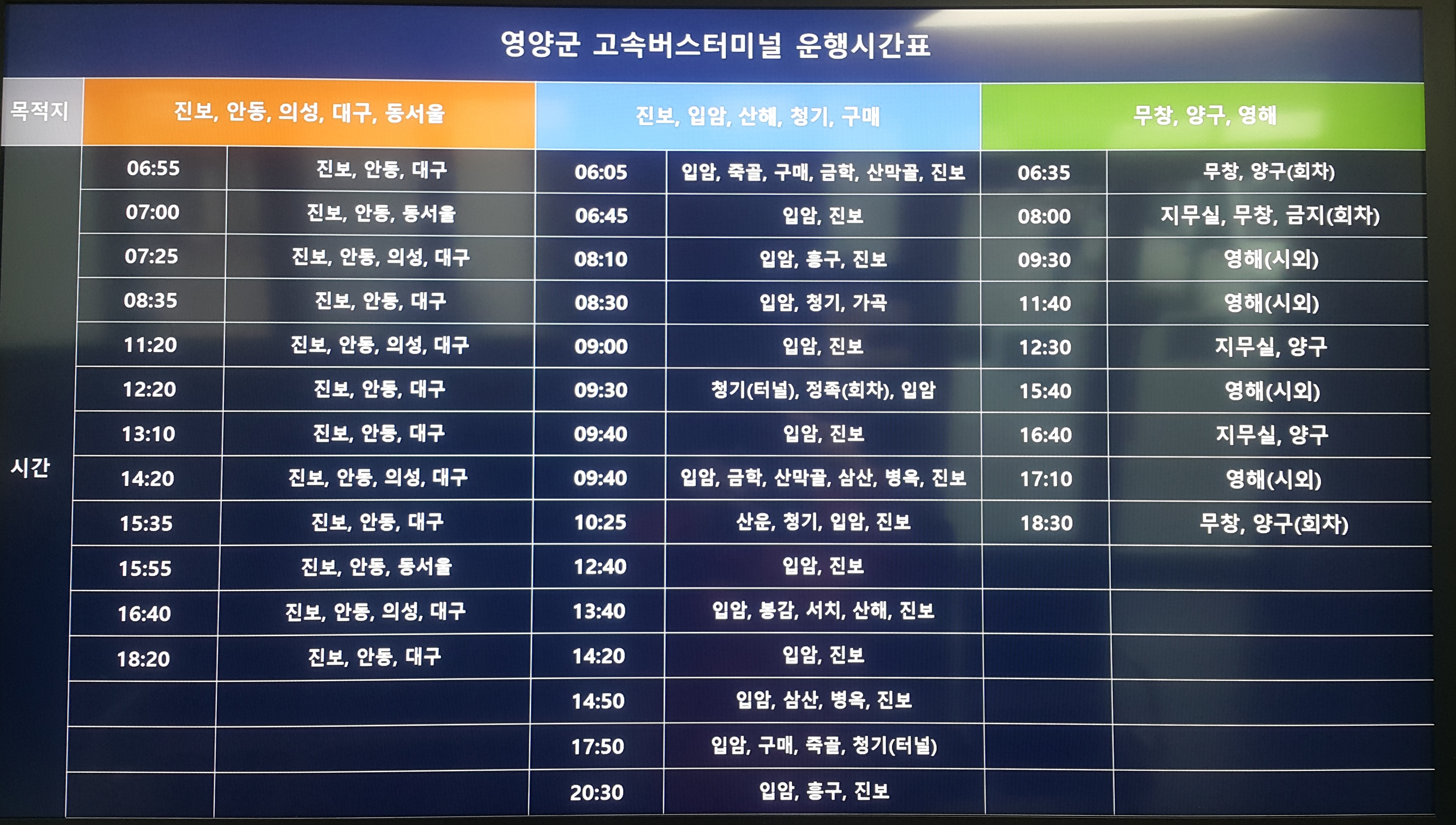 영양 출발 진보, 안동, 의성, 대구, 동서울, 진보, 입양, 산해, 청기, 구매, 무장, 영구, 영해 방면.