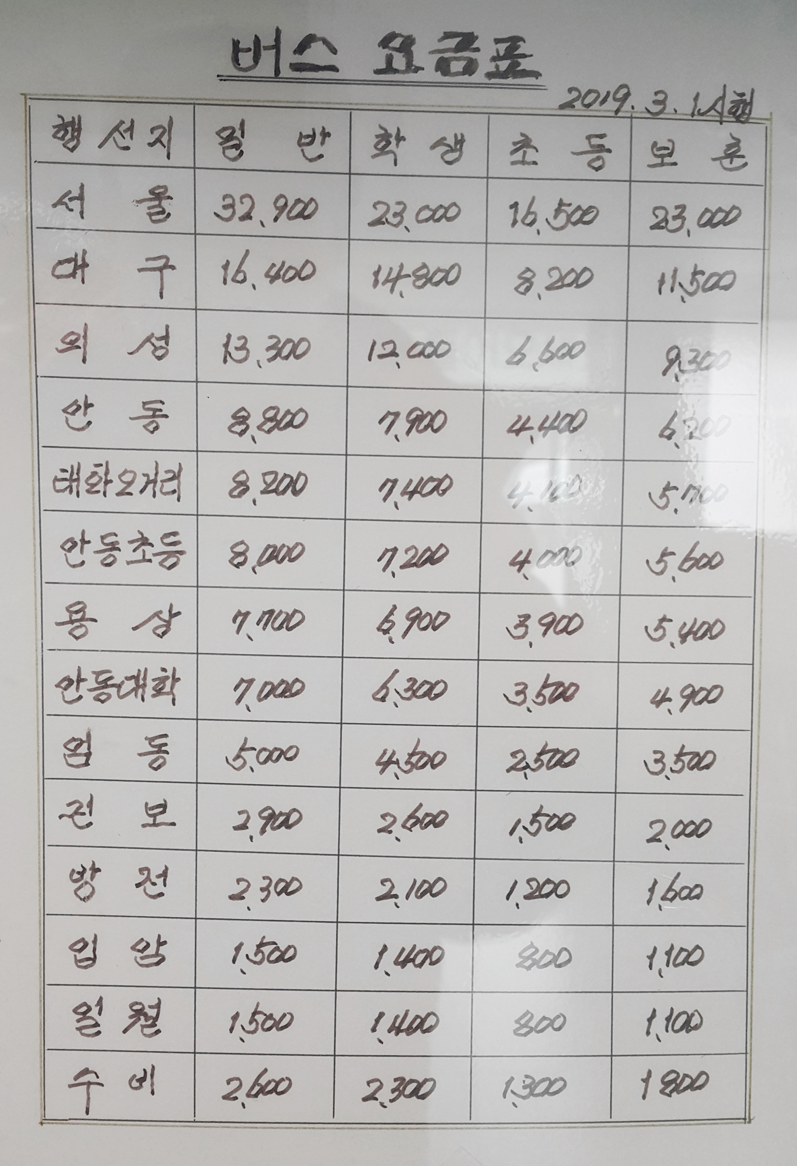 영양시외버스터미널 요금표