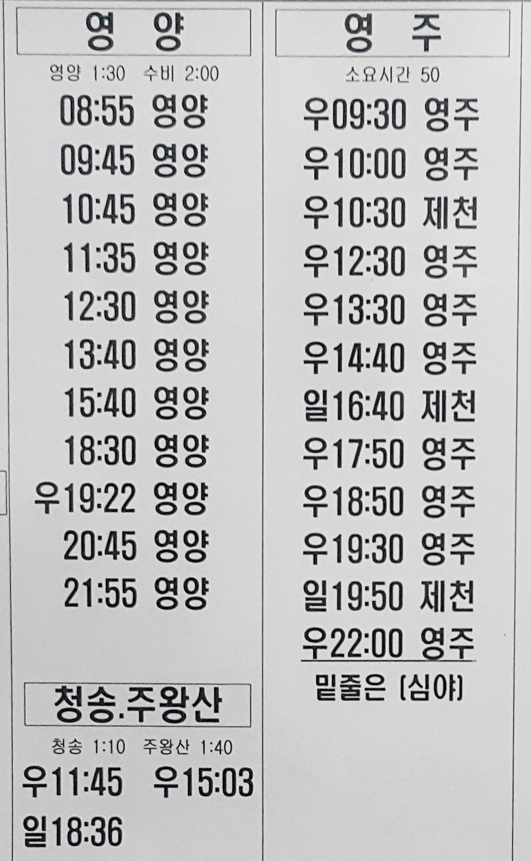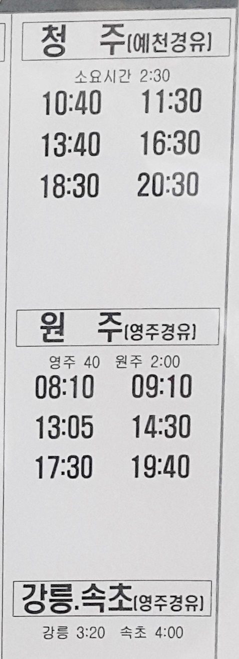 안동 출발 청주, 예천, 원주, 영주, 강릉, 속초 방면.
