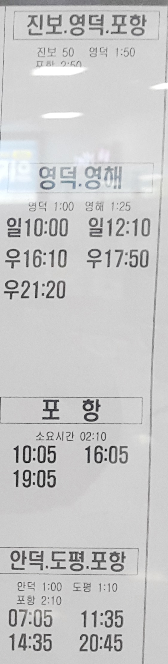 안동 출발 진보, 영덕, 포항, 영덕, 영해, 안덕, 도평 방면.