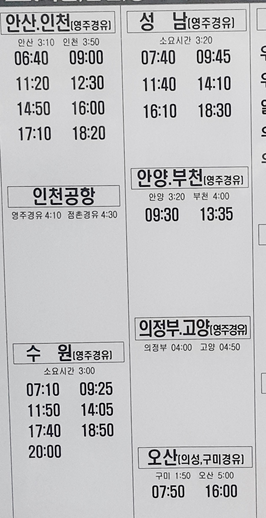 안동 출발 안산, 인천, 인천공항, 안양, 부천, 수원, 의정부, 고양, 안양, 부천, 오산, 성남 영주 경유 방면,