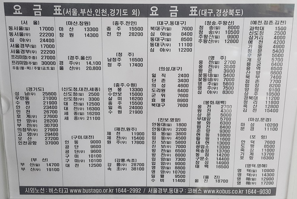 안동시외버스터미널 요금표