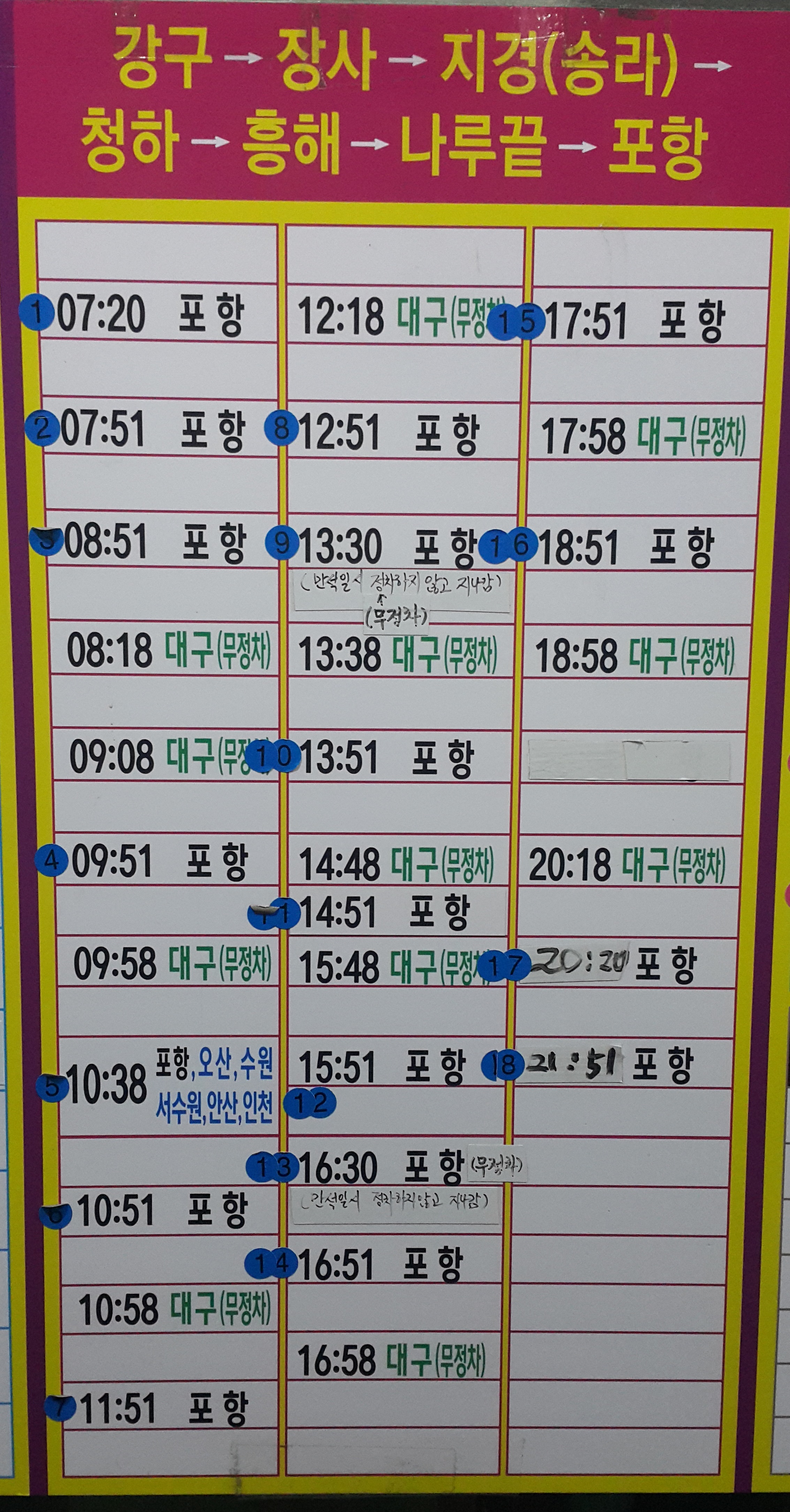 강구 출발 장사, 지경(송라), 청하, 흥해, 나루끝, 포항 방면.